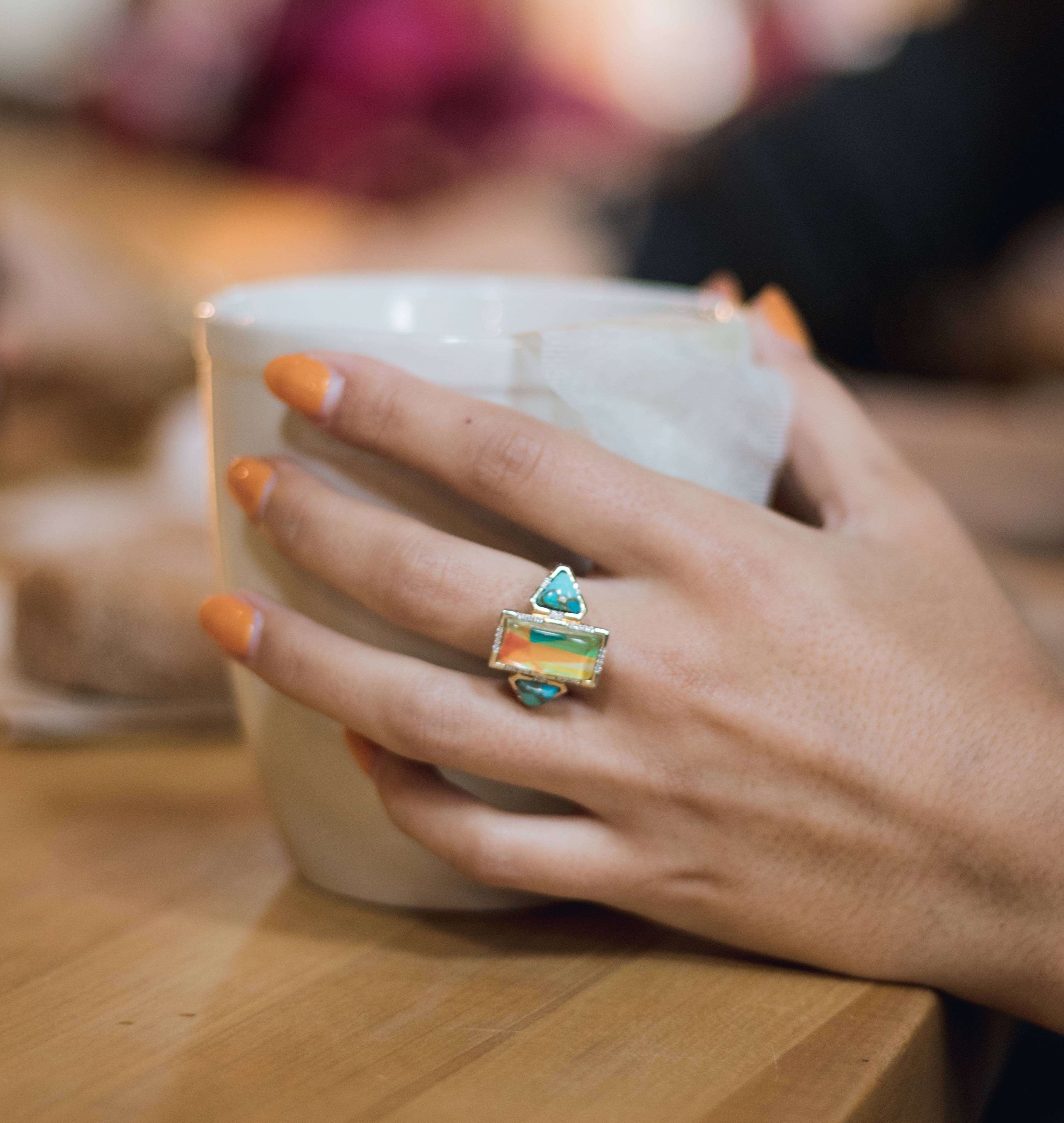 Crafted in 925 Sterling Silver this beautiful ring features trillion shaped turquoise stones alongside a rectangular colorful motif encased by crystal with 1/6 carats of diamonds in a plate prong setting. This ring is plated in 14KT Yellow Gold.