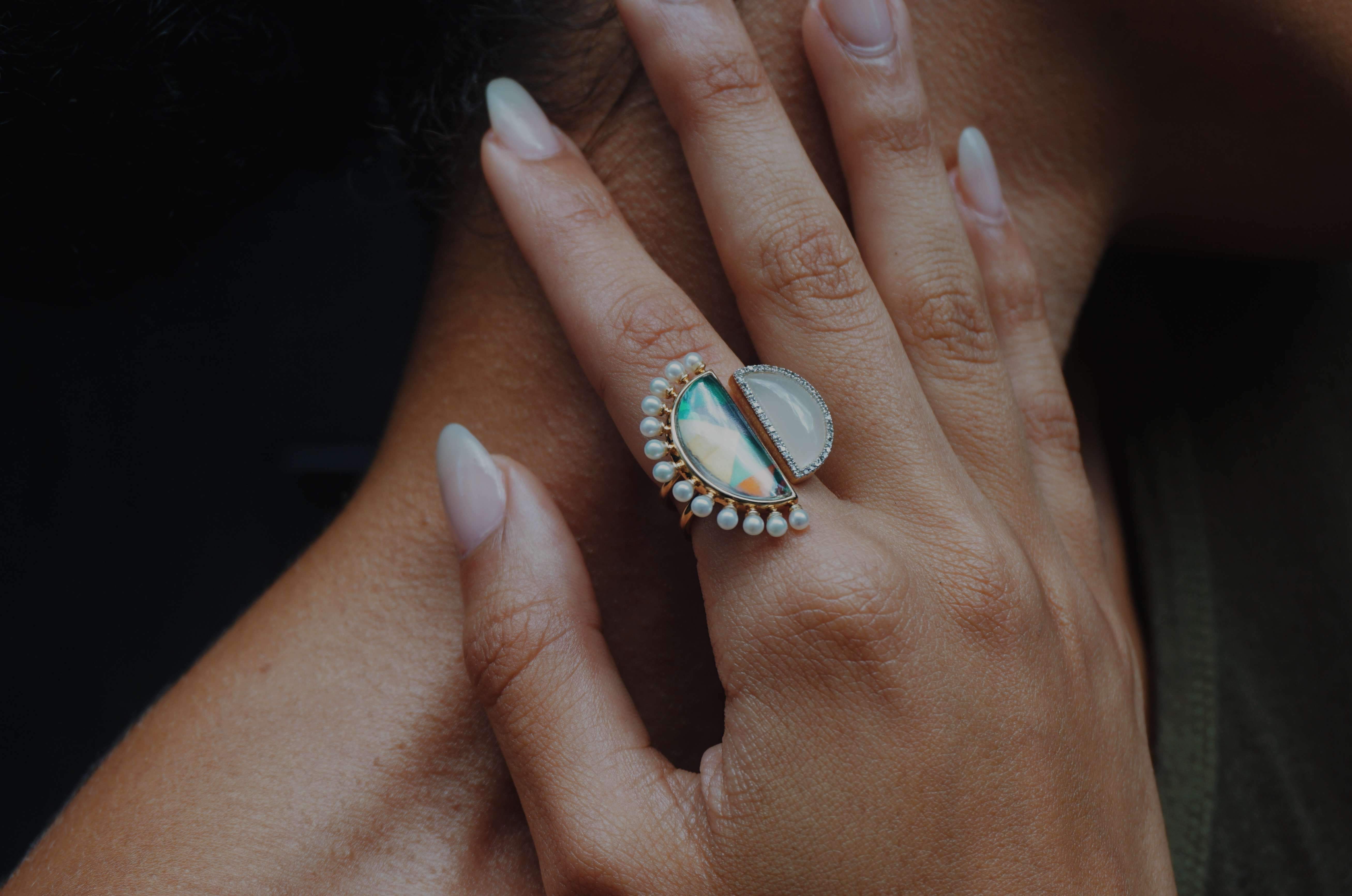 My Colorful Legacy Pearl & Moonstone Diamond Open Ring in 14K Yellow Gold Plated Sterling Silver