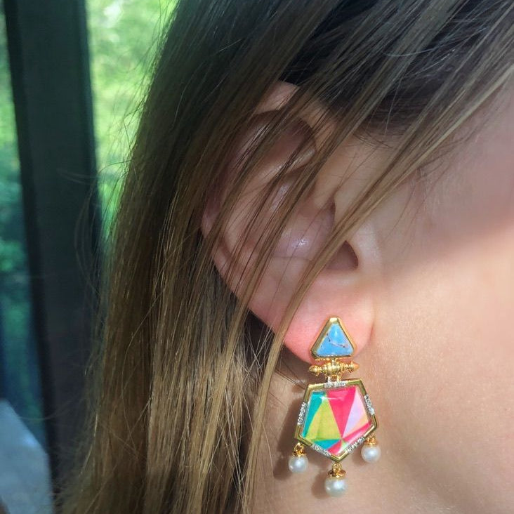 Wild & Free Diamond Mosaic Turquoise Earrings with Pearls in 14K Yellow Gold Plated Sterling Silver