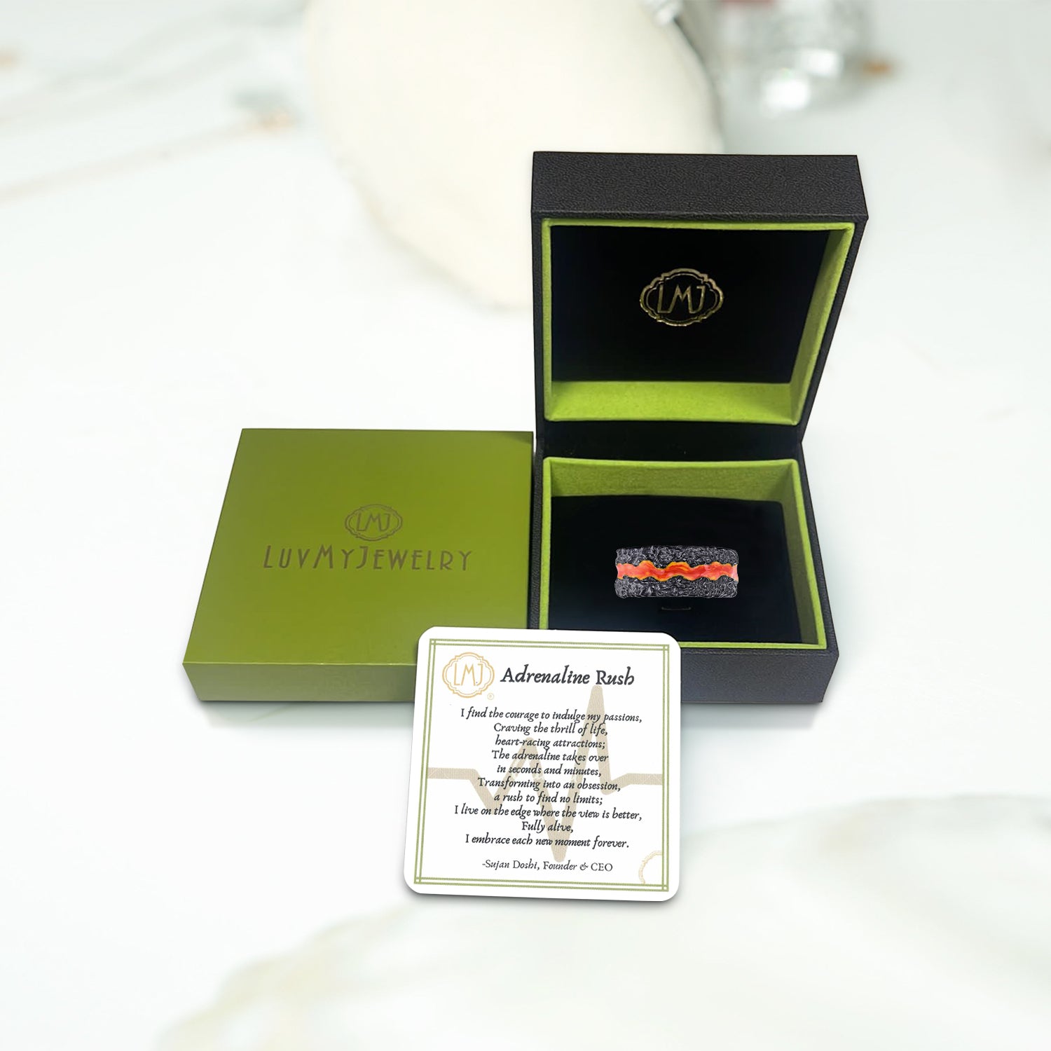 Fire in My Soul Black Rhodium Plated Sterling Silver Textured Red Orange Enamel Band Ring