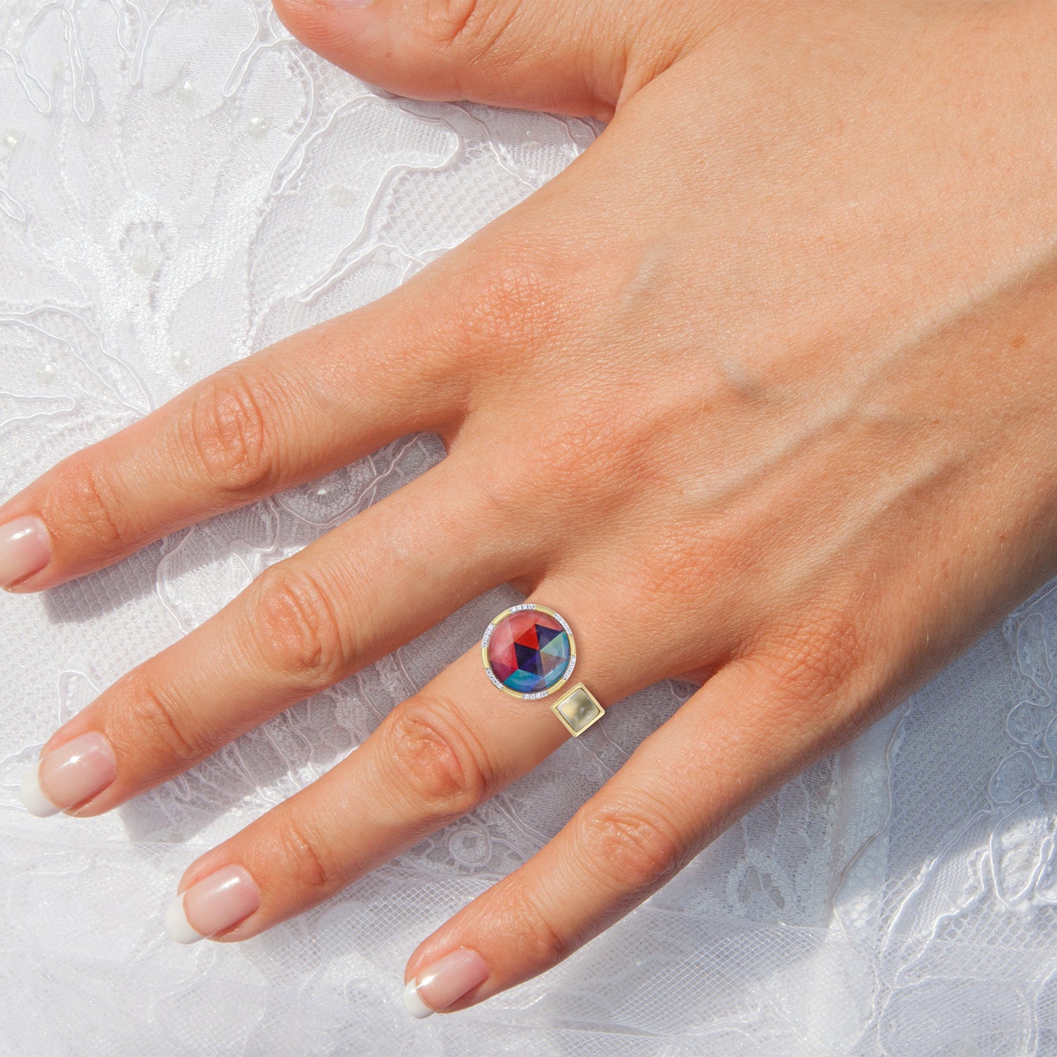 Crafted in 925 Sterling Silver this elegant open ring features a square shaped prehnite stone and circular colorful motif encased by crystal and encircled by 1/10 carats of diamonds in a plate prong setting. Can tighten or loosen the ring for a snug fit. Plated in 14 KT Yellow Gold.