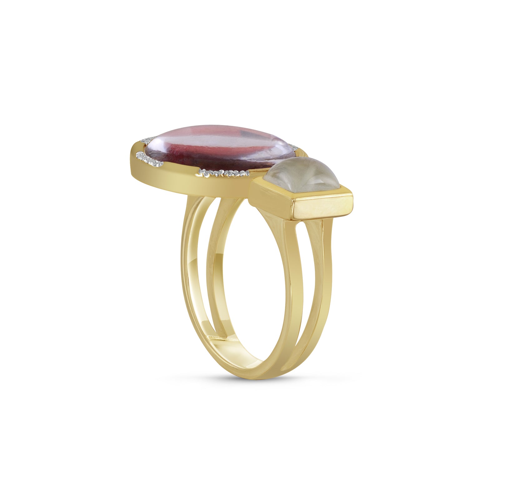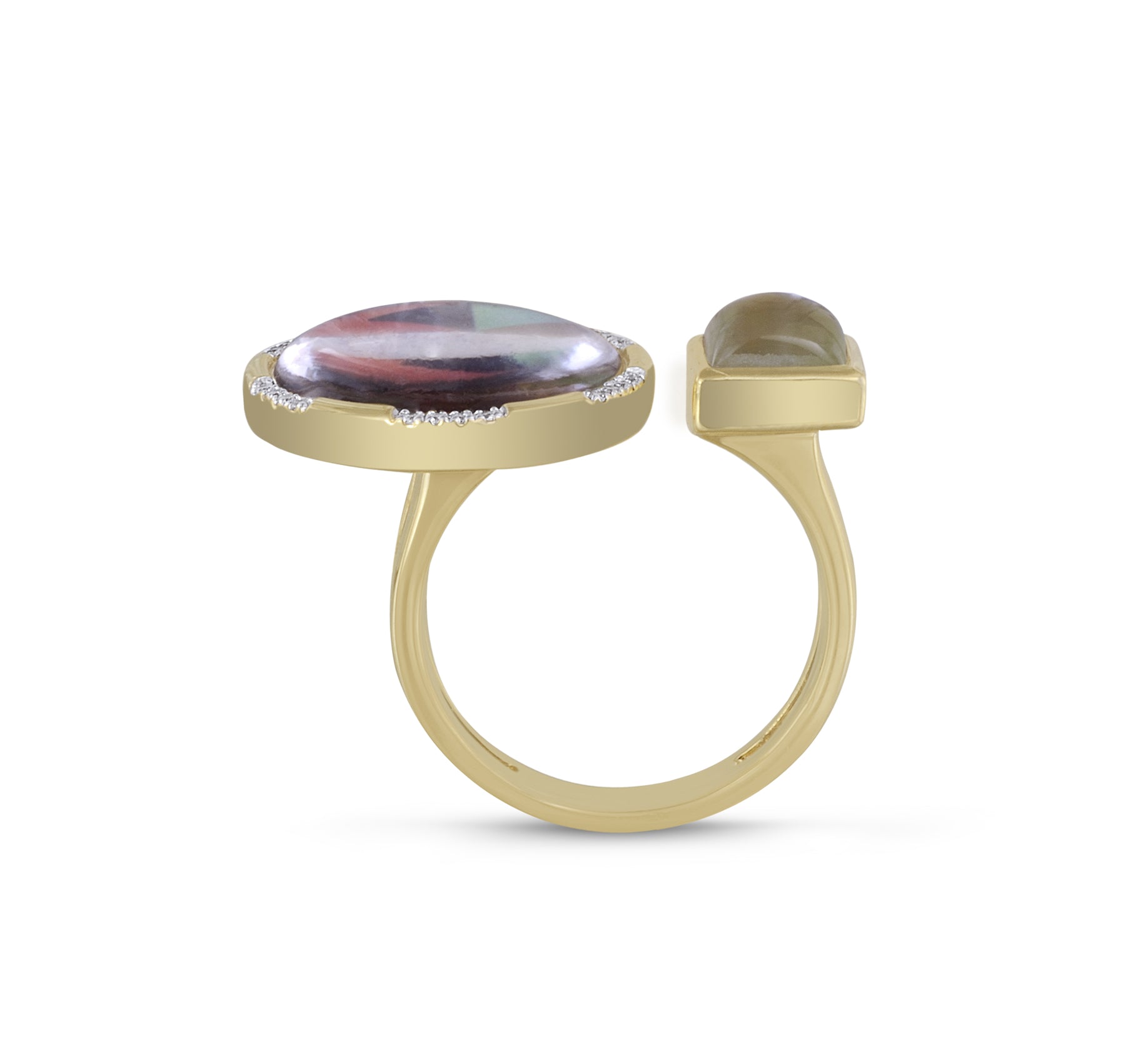 Pyramid Pop Prehnite & Diamond Mosaic Open Ring in 14K Yellow Gold Plated Sterling Silver