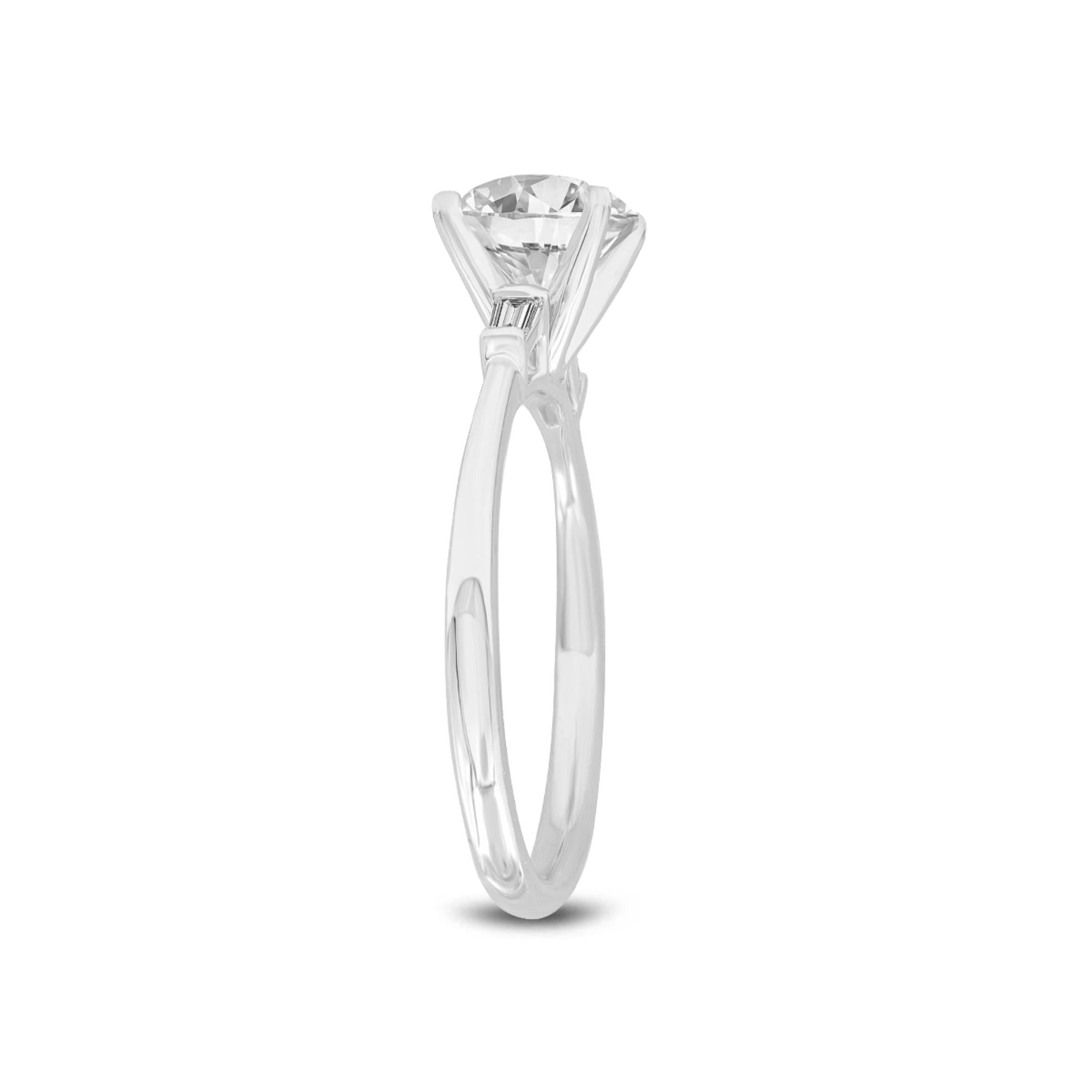 This 1.6 carat iconic three stone lab grown diamond ring features a sophisticated round shape lab grown center diamond with lab grown tapered baguettes on each side. Elegantly made in 14K gold and showcased in classic prong and channel settings. Perfect for special occasions including engagements and weddings. The ring is accompanied with an IGI certificate with the certificate number inscribed within the band. Diamond carat weight may fluctuate 0.05 carats ABOVE the stated number.