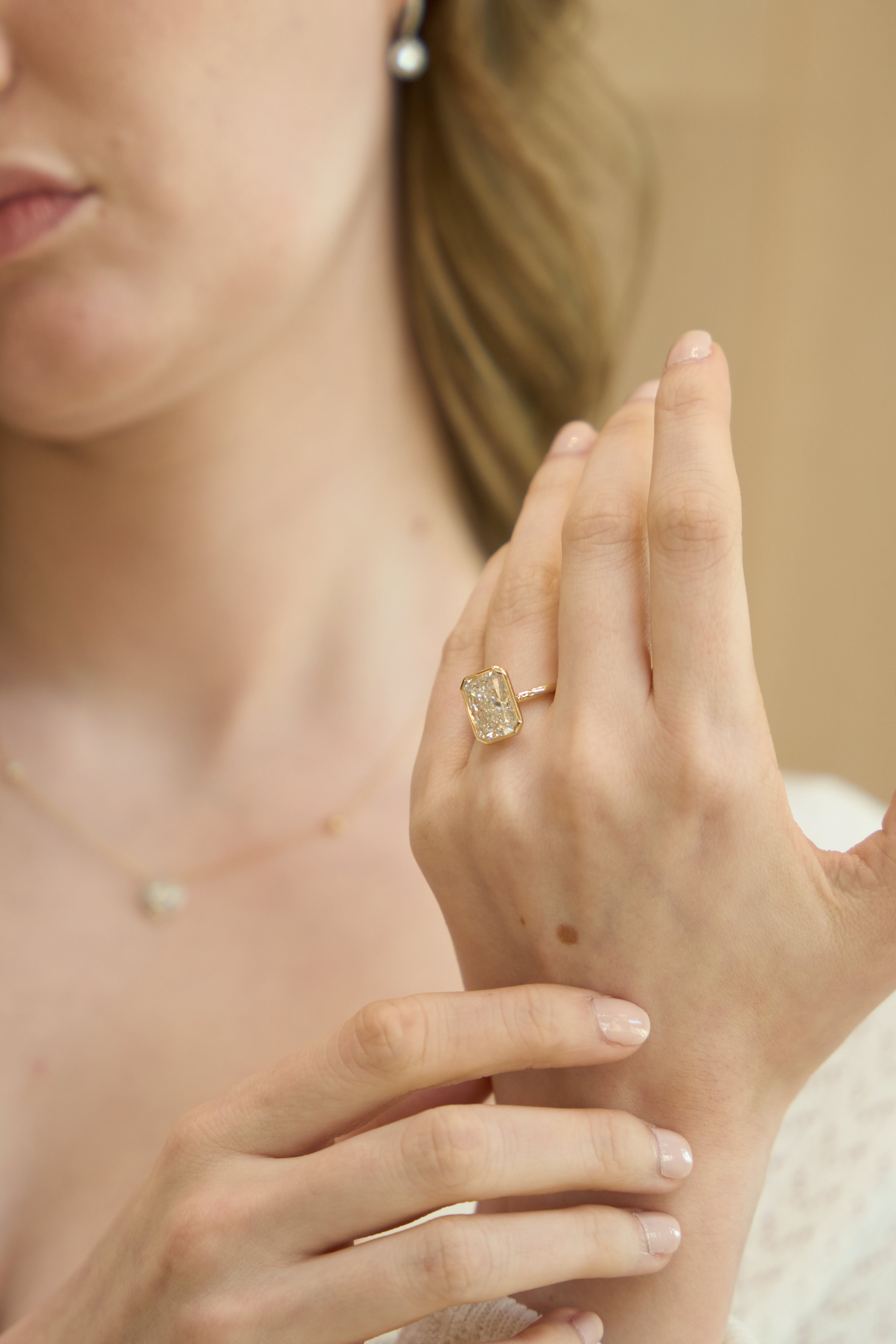 Modern elegance meets timeless intention with the Nerina Engagement Ring. Featuring a 5 carat brilliant radiant-cut lab grown solitaire diamond in a sleek bezel setting, this design is crafted in polished 14K gold for a clean, contemporary finish. The bezel setting offers both durability and minimalist beauty, wrapping the center stone in a smooth frame that enhances its fire and brilliance.