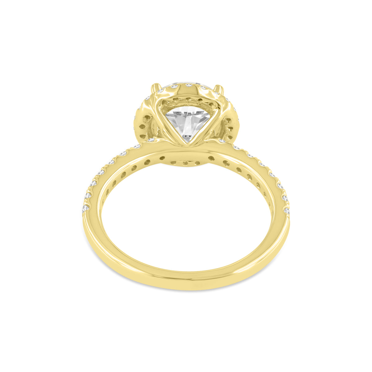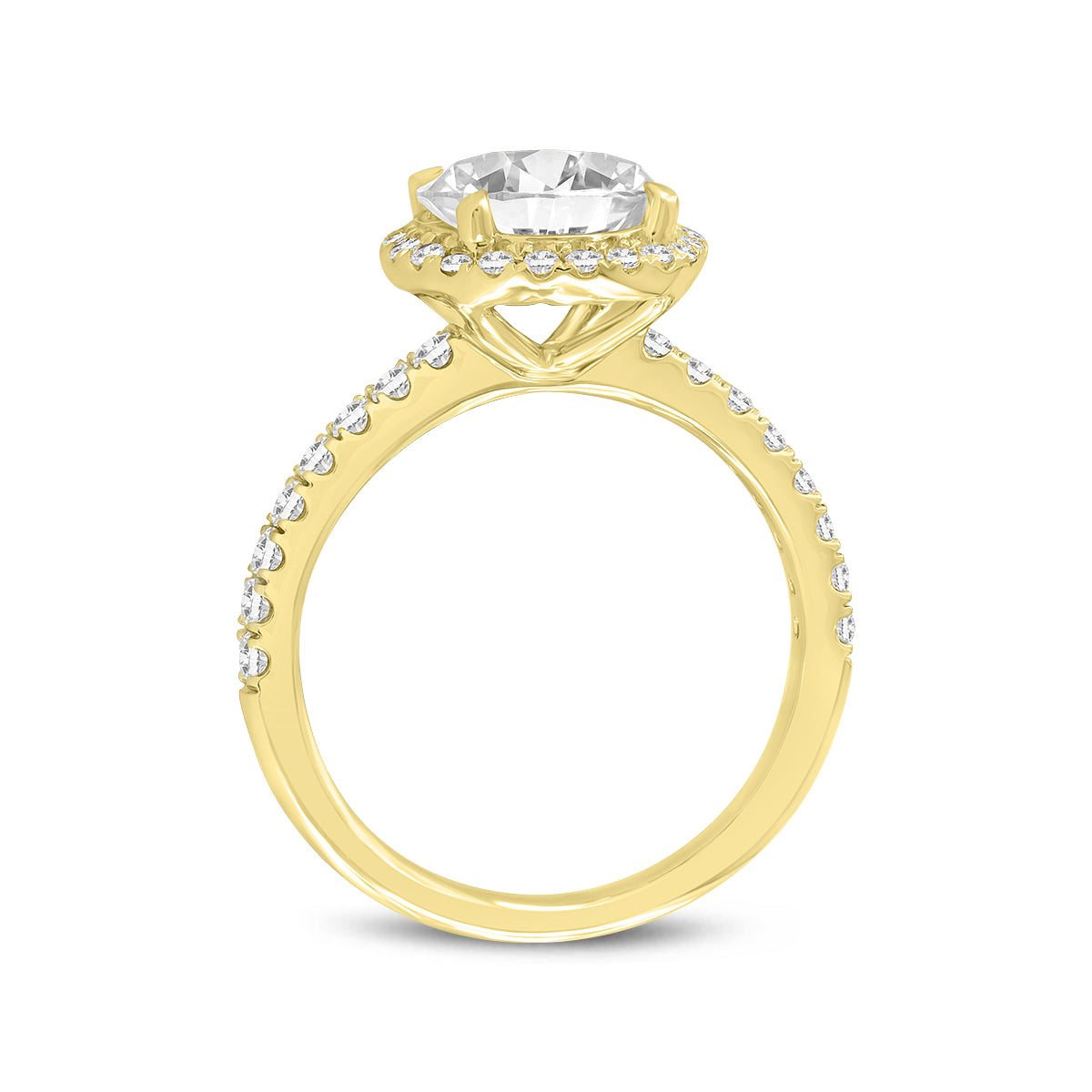 This timeless ring features a stunning 2.45 carat round shaped lab grown diamond ring with a halo and brilliant cut lab grown diamonds along the side. Elegantly made in 14K yellow gold and showcased in a classic four prong setting. Perfect for special occasions including engagements and weddings. The ring is accompanied with an IGI certificate with the certificate number inscribed within the band. Diamond carat weight may fluctuate 0.05 carats ABOVE the stated number.