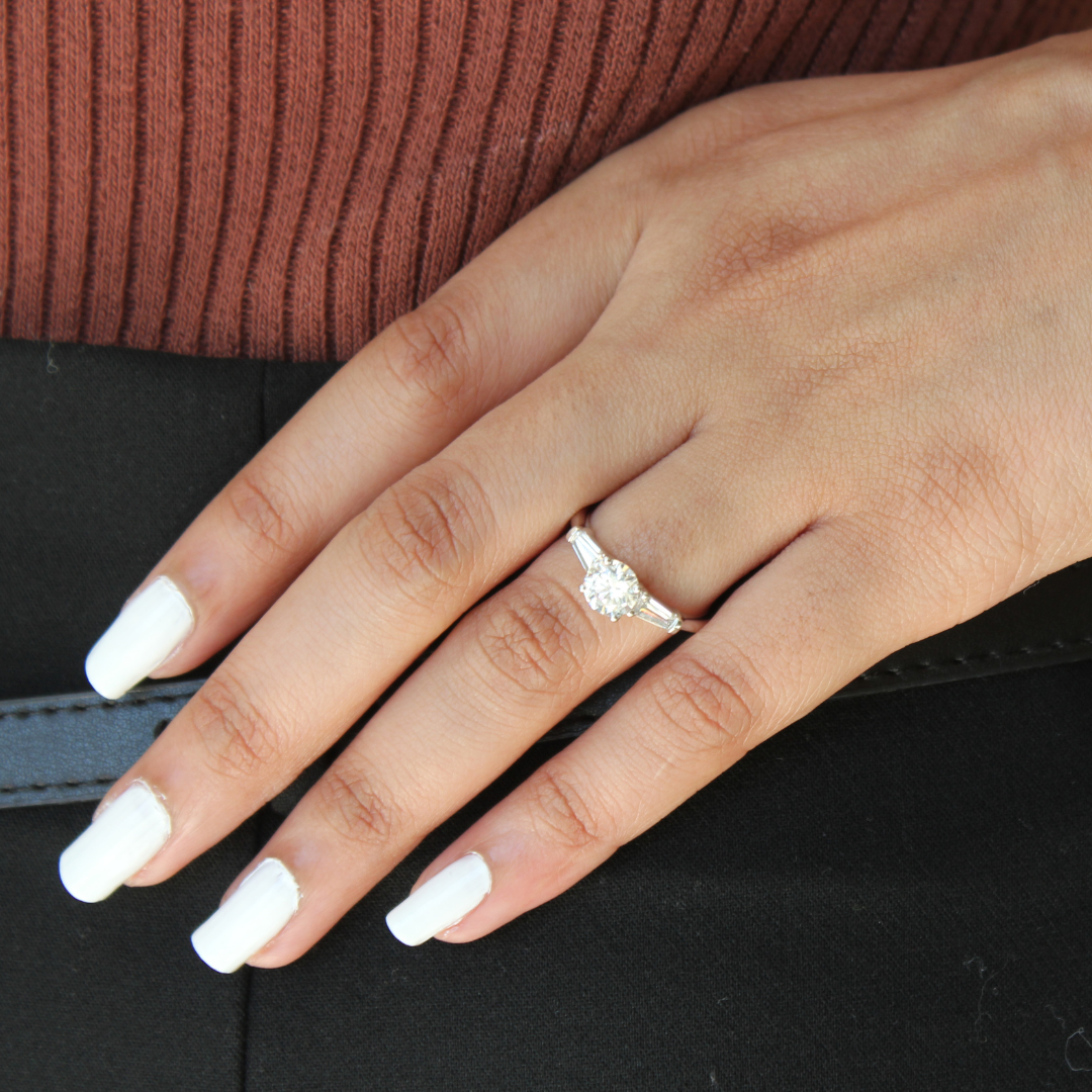 This luminous 1.48 ct tapered baguette and round cut lab grown diamond three stone ring celebrates your journey. Each sparkling stone is a testament to your past present and the infinite promise of your future together. The ring is accompanied with an IGI certificate guaranteeing authenticity and with the certificate number inscribed within the band. Diamond carat weight may fluctuate 0.05 carats ABOVE the stated number.