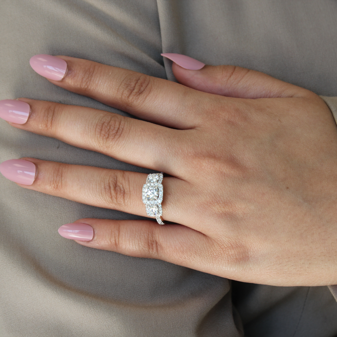 This breathtaking 2 ct trinity ring in 14K gold showcases three brilliant round cut lab grown diamonds. Each diamond is encircled by a shimmering halo and complemented by delicately set side diamonds on the band for an extra touch of elegance. The ring is accompanied with an IGI certificate guaranteeing authenticity and with the certificate number inscribed within the band. Diamond carat weight may fluctuate 0.05 carats ABOVE the stated number.