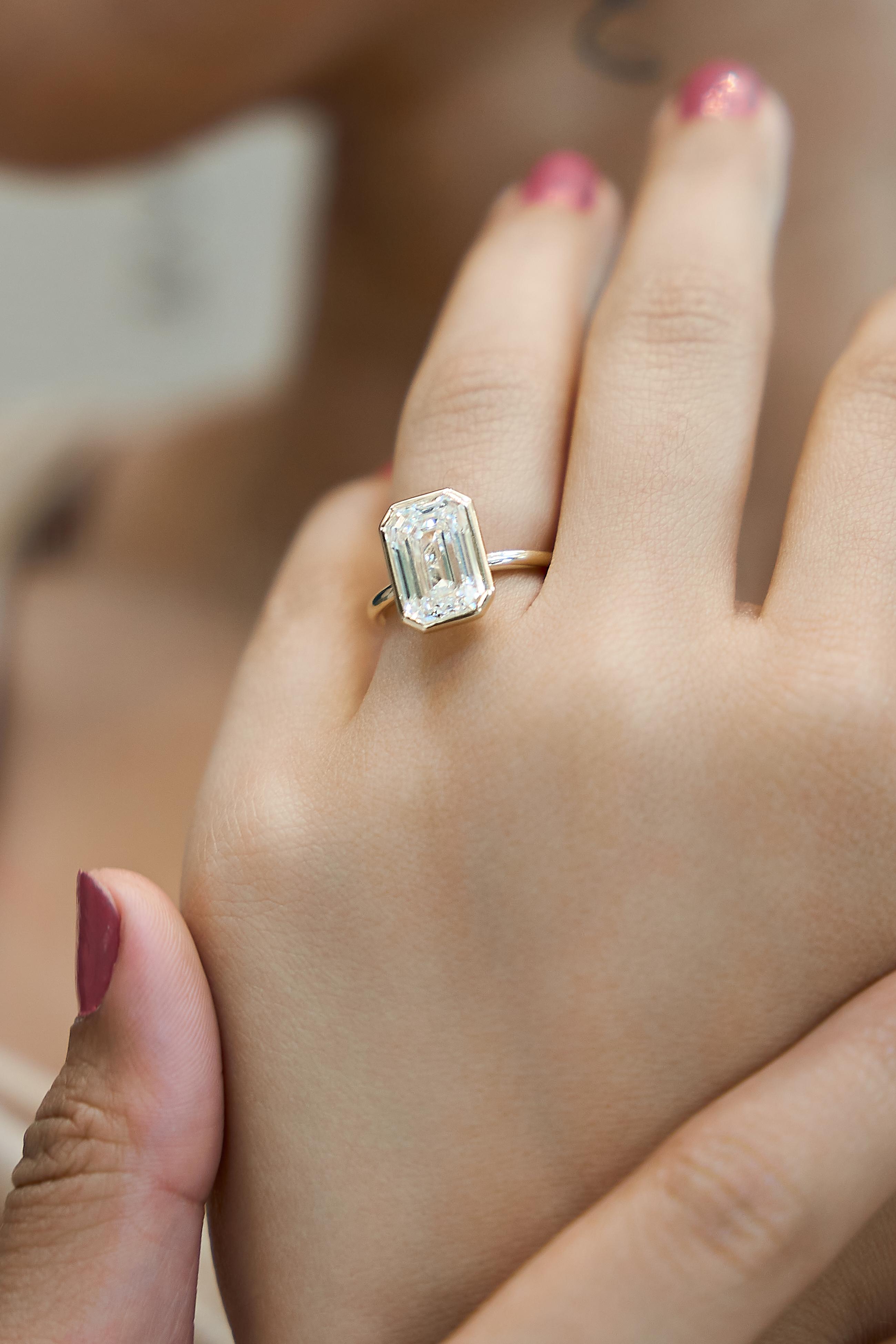 Modern minimalism meets timeless elegance in this stunning Emerald Bezel Engagement Ring. Featuring a bold 5 carat emerald-cut lab grown diamond solitaire, this design is set in a sleek, full bezel setting that offers a smooth, sculptural profile and everyday wearability.