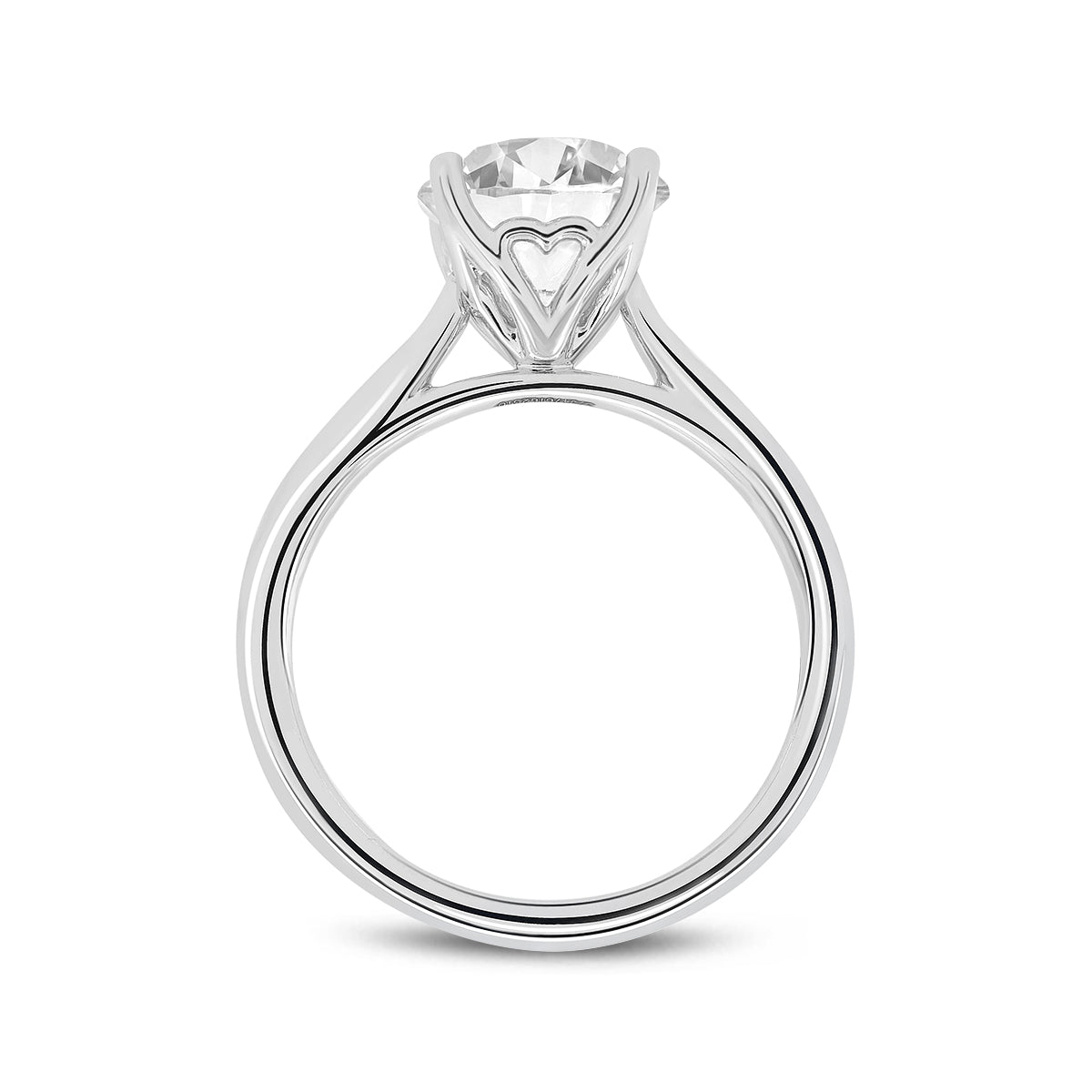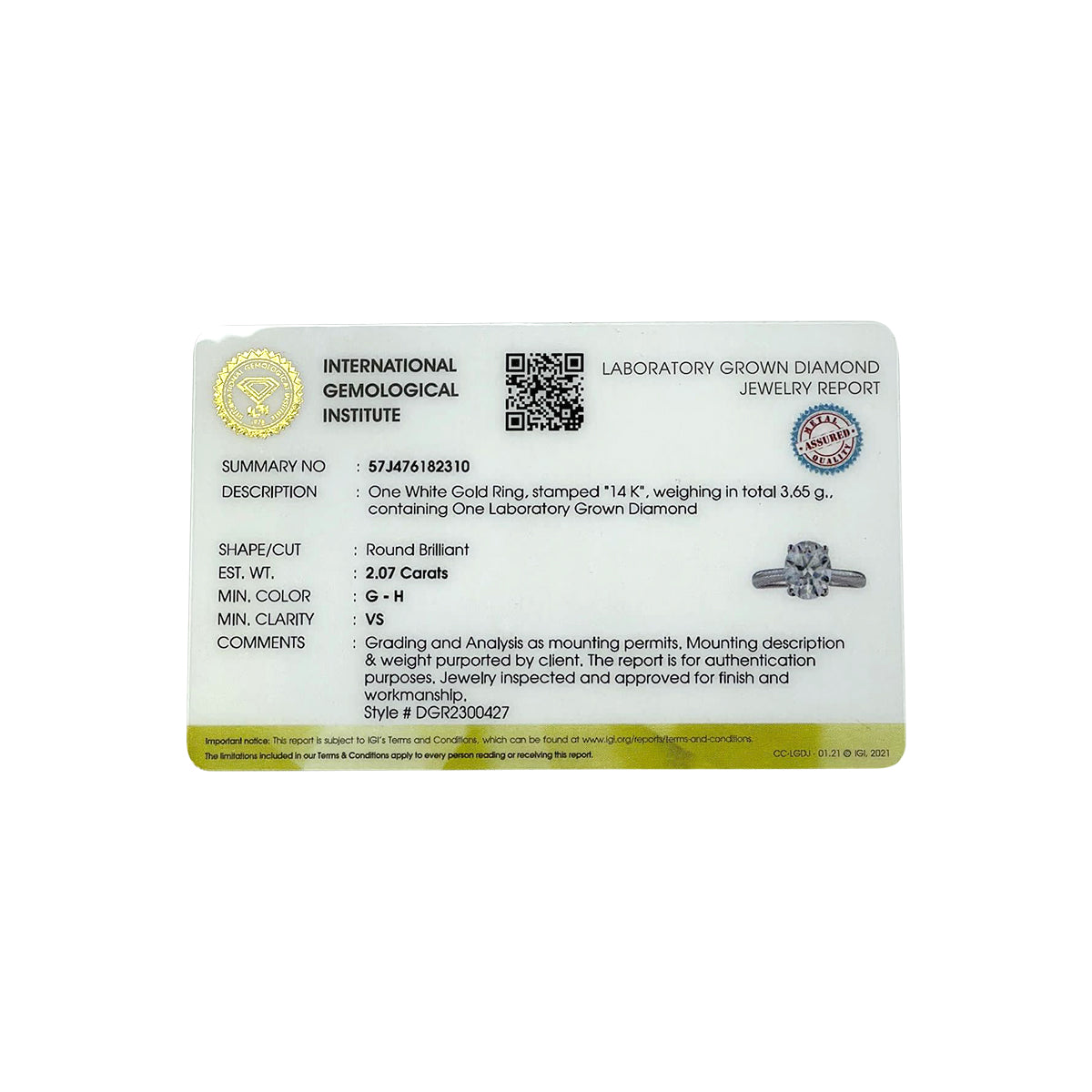 This 14K Gold solitaire ring features a 2.50 Ctw. round cut lab grown diamond in a classic four prong setting. An elegant piece of jewelry that acts as the perfect engagement ring but also a suave cocktail ring as well. The ring is accompanied with an IGI certificate with the certificate number inscribed within the band. Diamond carat weight may fluctuate 0.05 carats ABOVE the stated number.