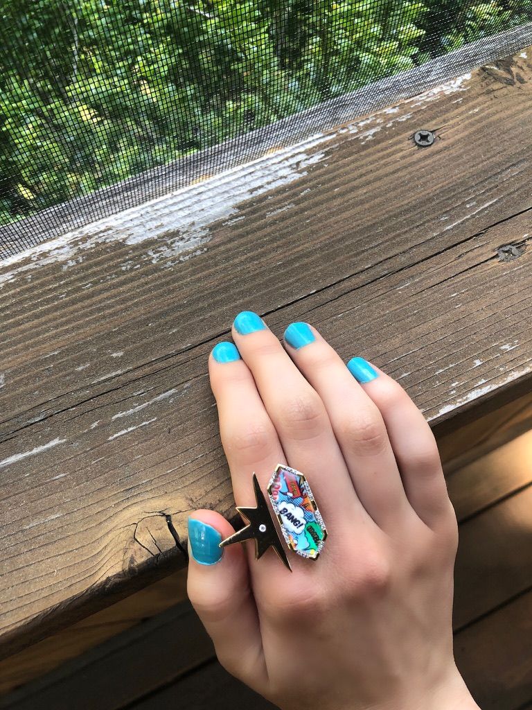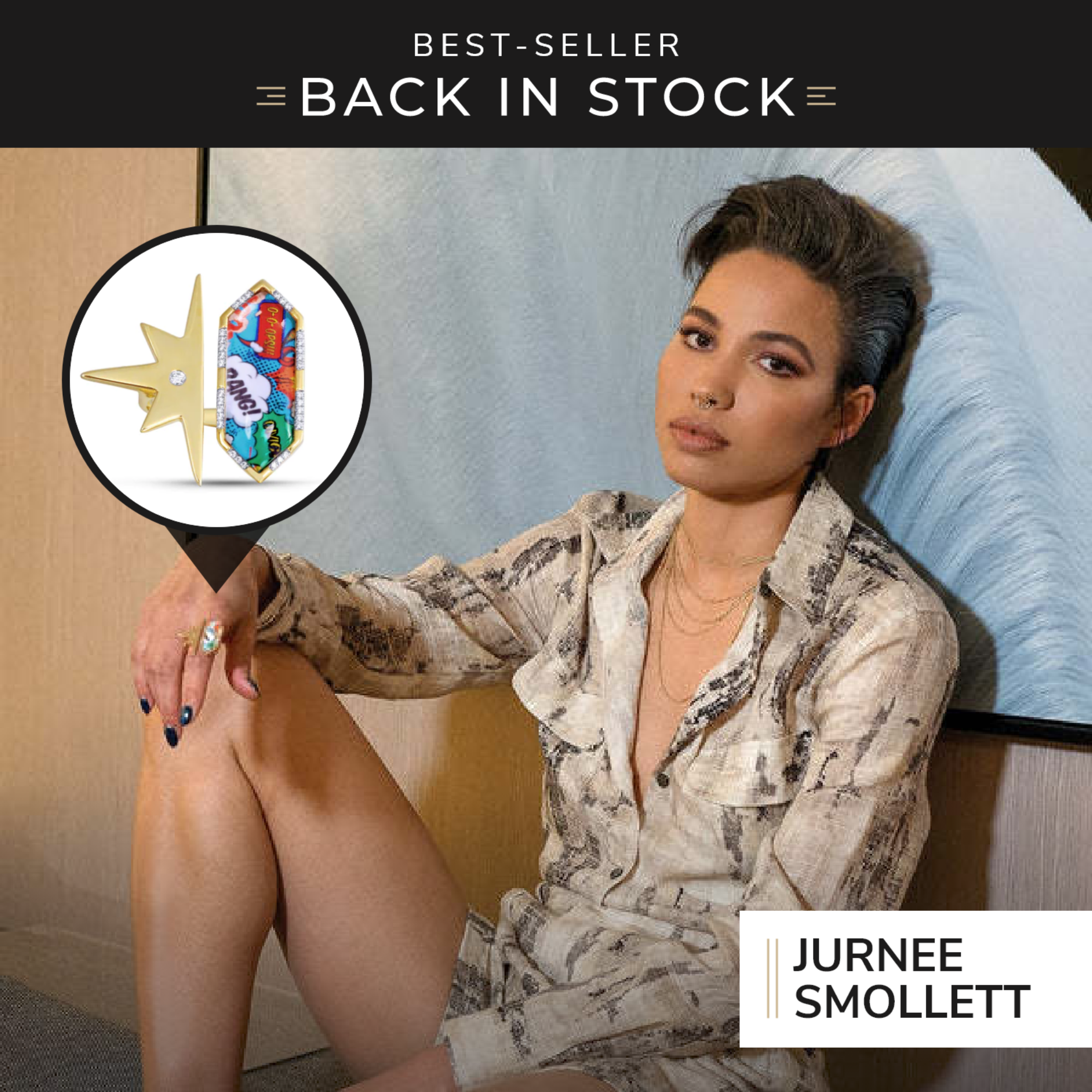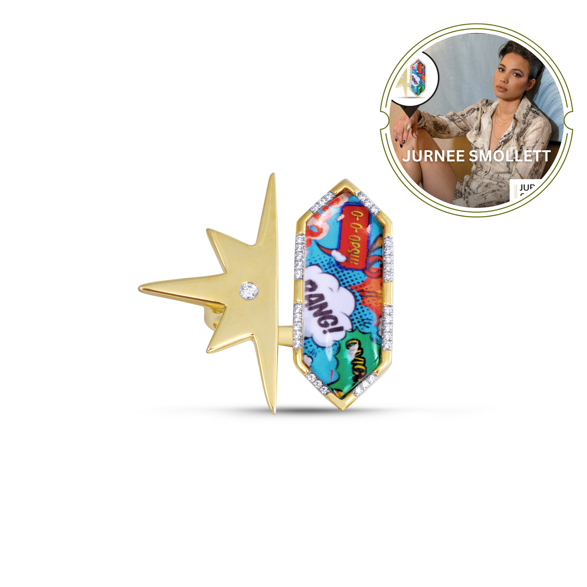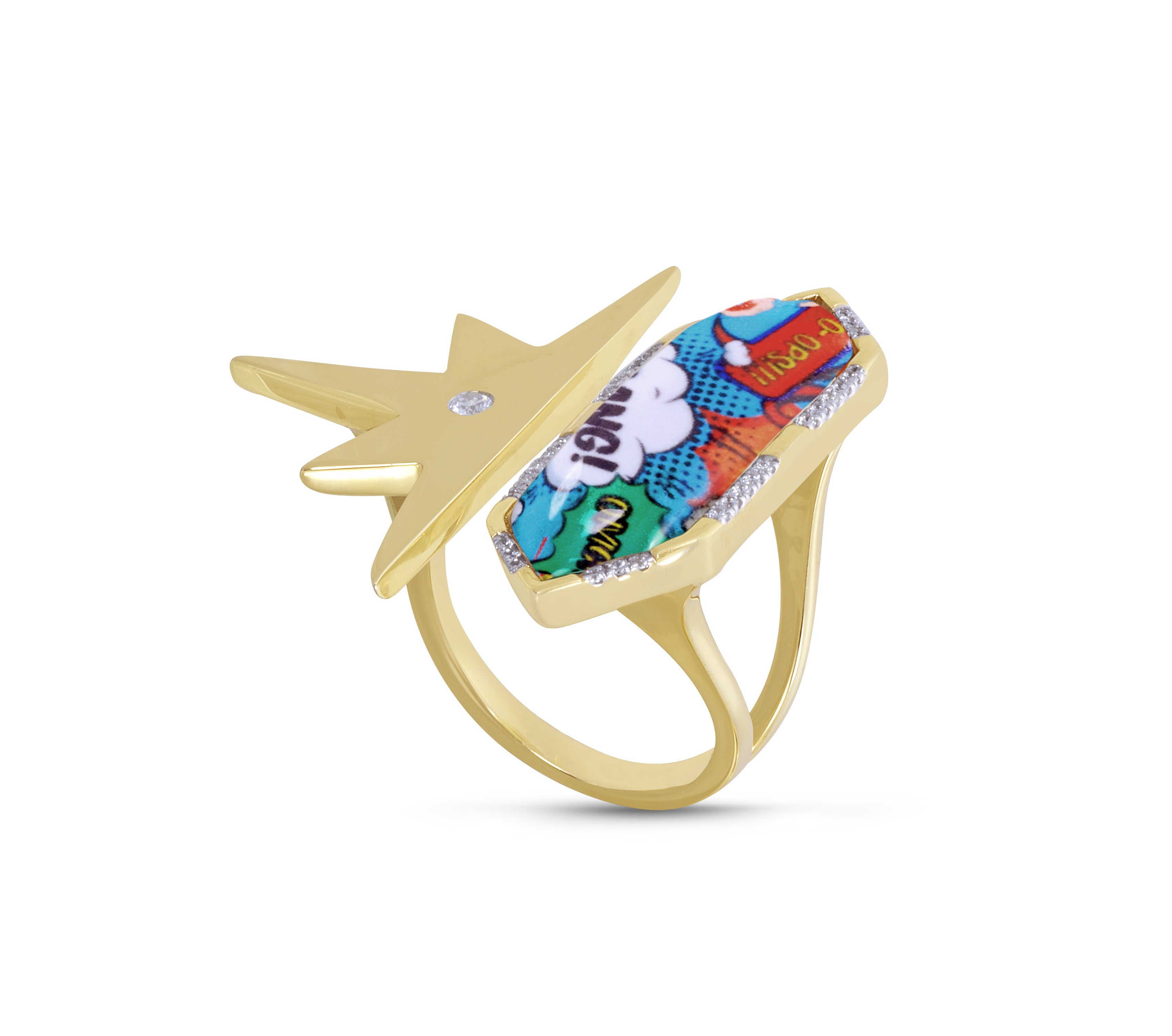 Crafted in 925 Sterling Silver this open ring features a metal star design and a comic inspired geometric 'Bang' motif encased by crystal set alongside 1/6 carats of certified diamonds in flush and plate prong settings. Can tighten or loosen the ring for a snug fit. Plated in 14 KT Yellow Gold.