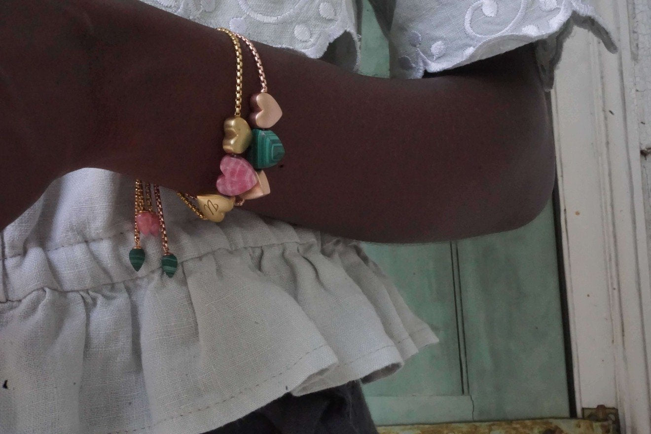 Luv Me Malachite Bolo Adjustable I Love You Heart Bracelet in 14K Rose Gold Plated Sterling Silver