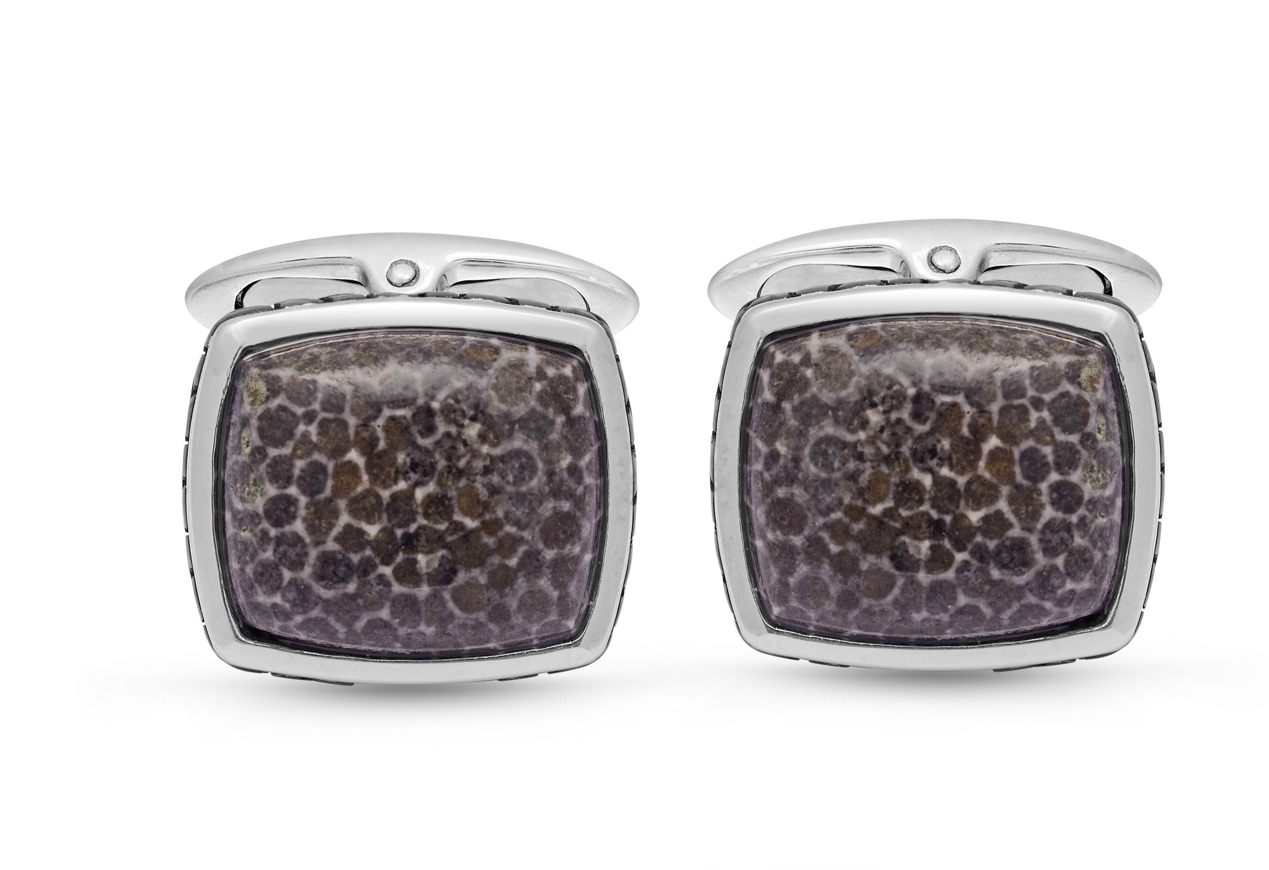 Fossil Agate Stone Cufflinks in Black Rhodium Plated Sterling Silver