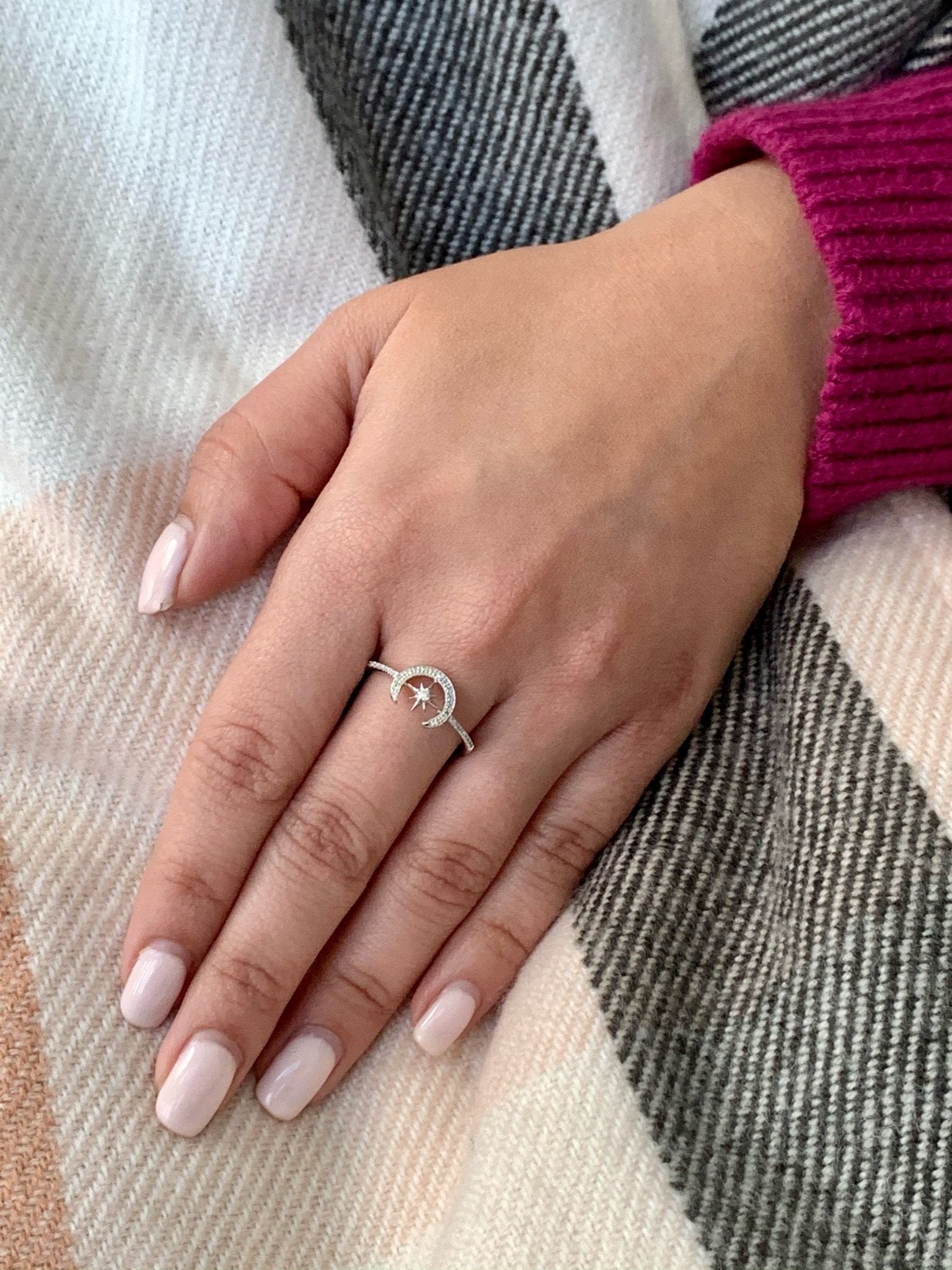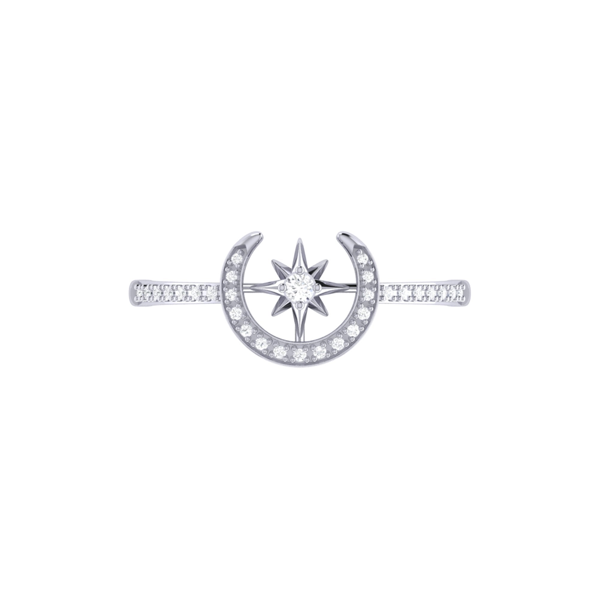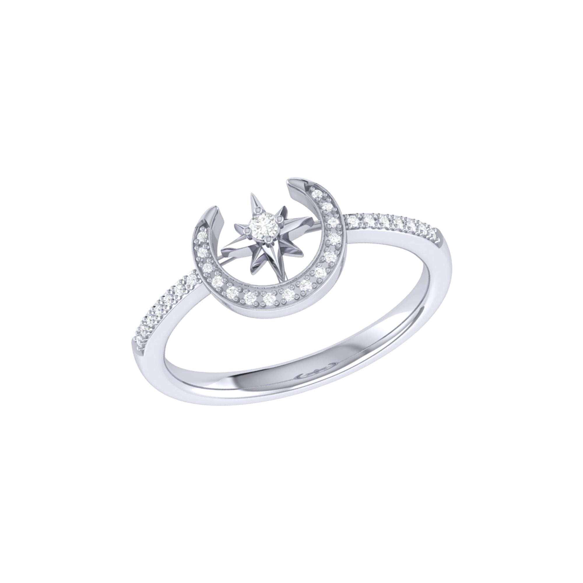 The Crescent North Star Ring adds a subtle edge to a beautifully classic design. Crafted in 14K White Gold, this ring features 100% natural, genuine diamonds. 0.11 carats of diamonds are used in individual flat pave and collet prong settings. This ring is offered in custom sizes. The ring thickness ranges from 2 mm to 8.3 mm.
