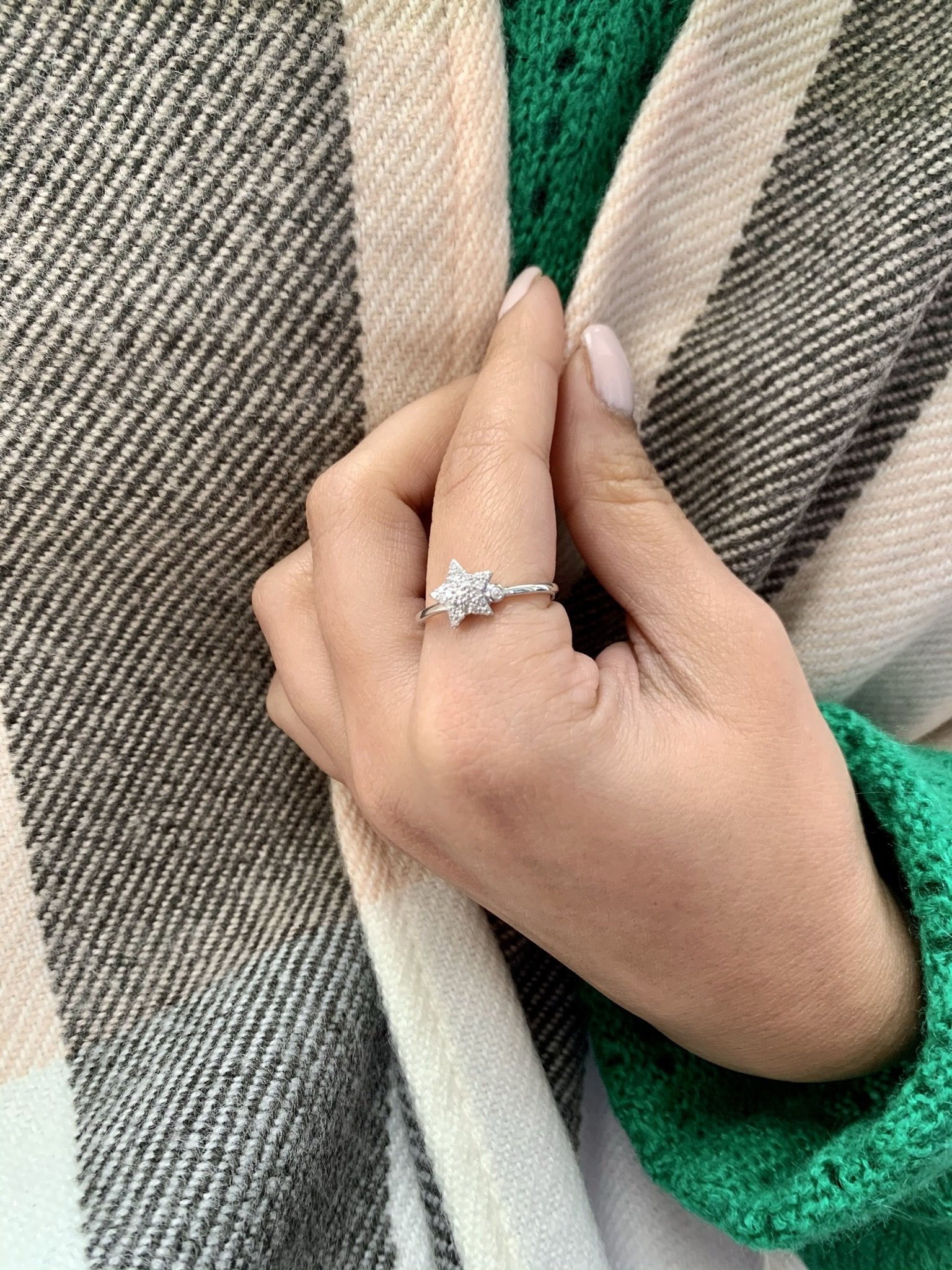 Slip into a whimsical, mesmerizing dream with the Dazzling Star Bezel Ring. Crafted in 14K White Gold, this ring features 100% natural, genuine diamonds. 0.12 carats of diamonds are used in micro pave & bezel settings. This ring is offered in custom sizes. The ring thickness ranges from 3.4mm to 9.4mm.