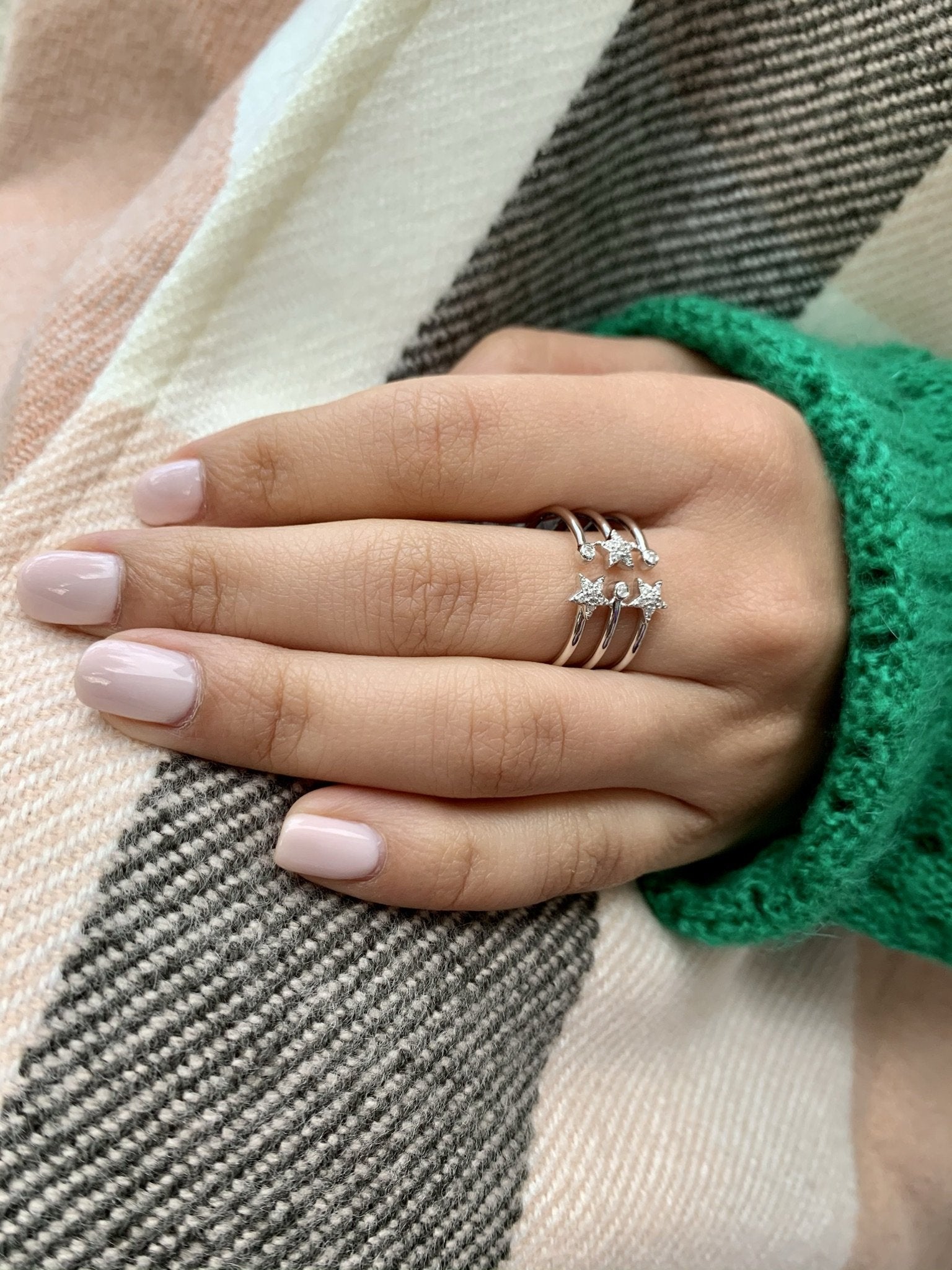 The Dazzling Star Bezel Trio Ring adds the perfect amount of shine for any and every occasion. Crafted in 14K White Gold, this ring features 100% natural, genuine diamonds. 0.12 carats of diamonds are used in micro pave & bezel settings. This ring is offered in custom sizes. The ring thickness ranges from 2mm to 13.5mm.
