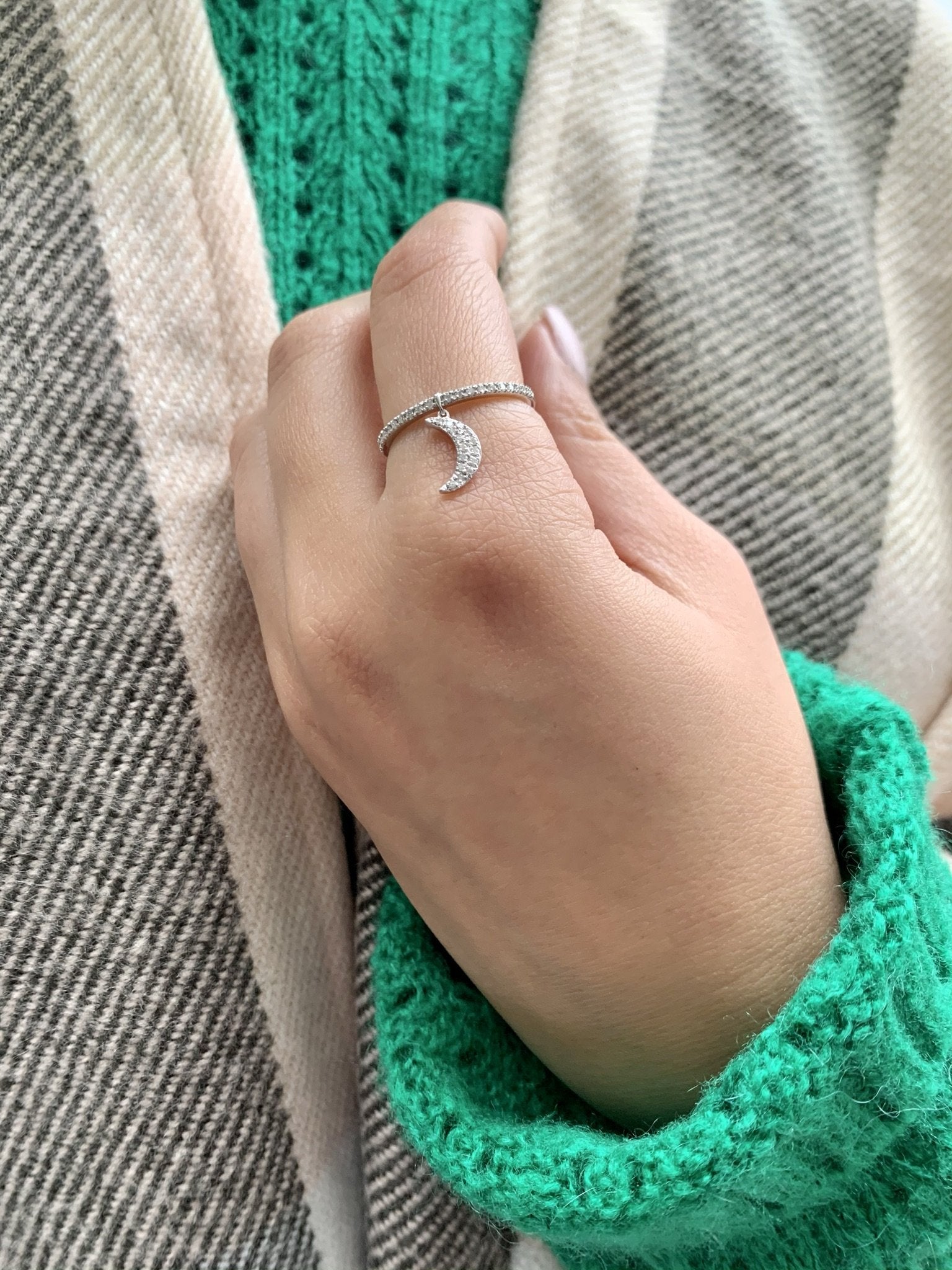 Feel a connection between the lunar glow and your own aura with the Moonlit Charm Ring. Crafted in 14K White Gold, this ring features 100% natural, genuine diamonds. 0.14 carats of diamonds are used in an individual plate prong setting. This ring is offered in custom sizes. The ring thickness ranges from 2.1mm to 12.9mm.