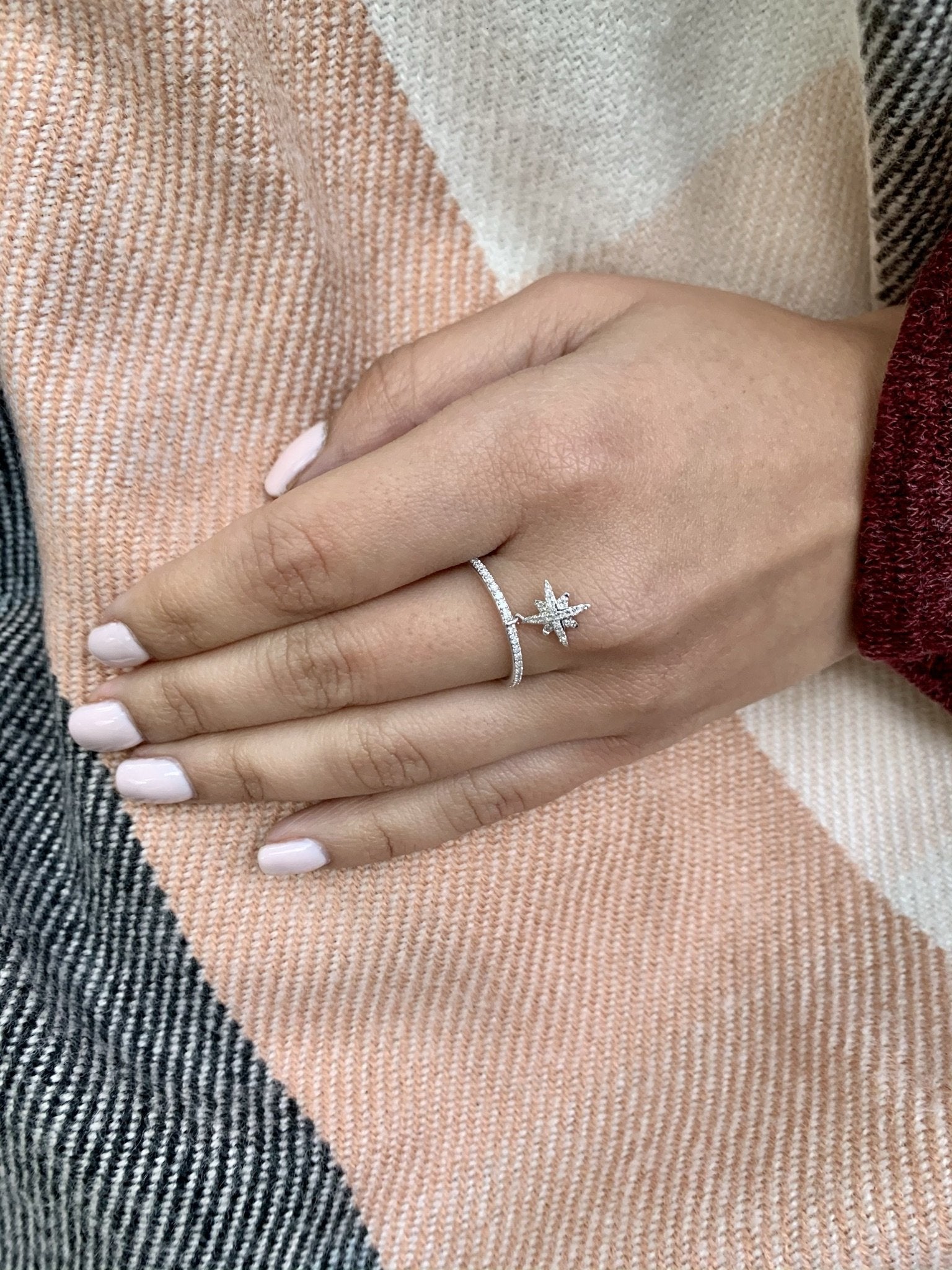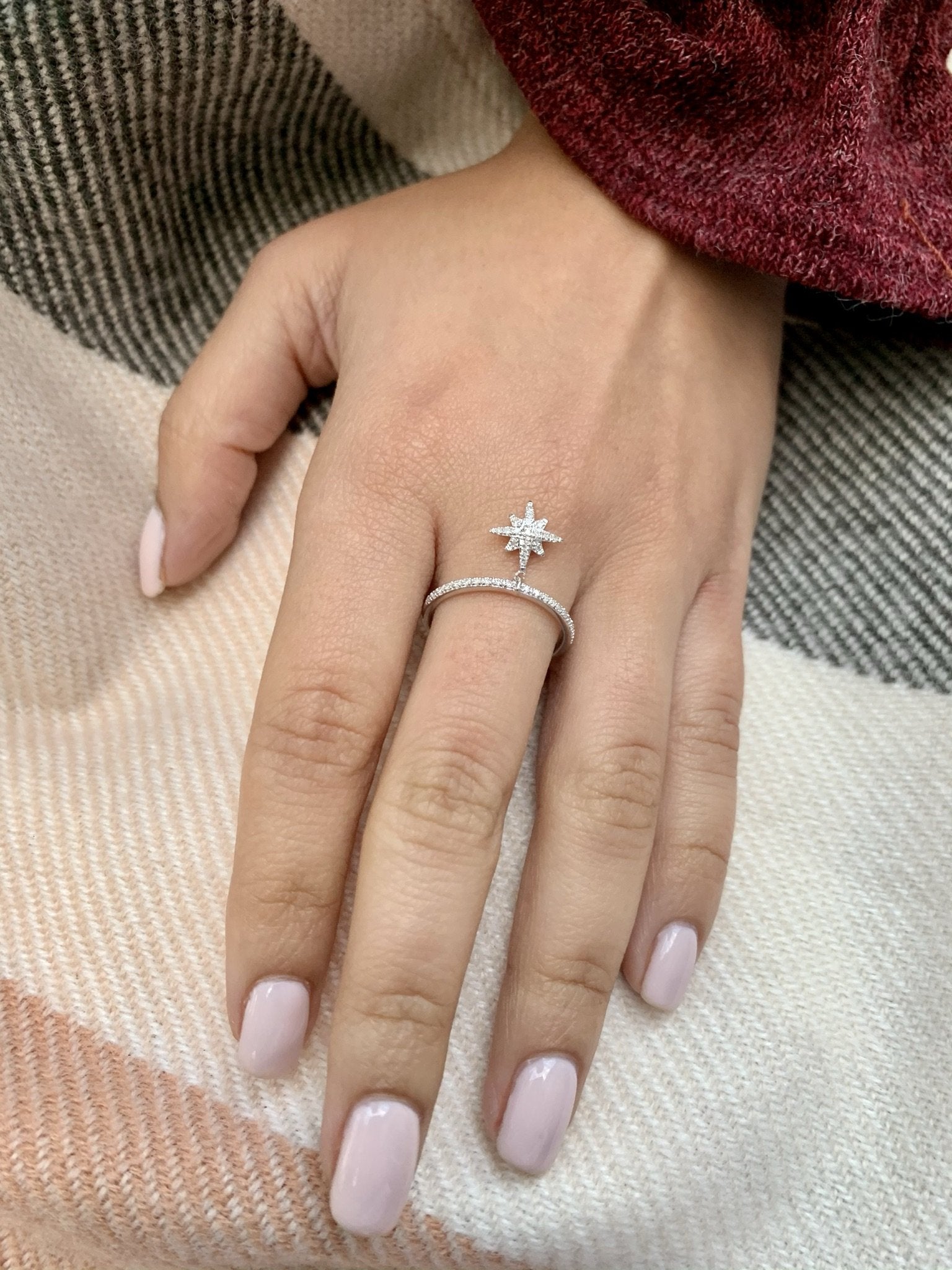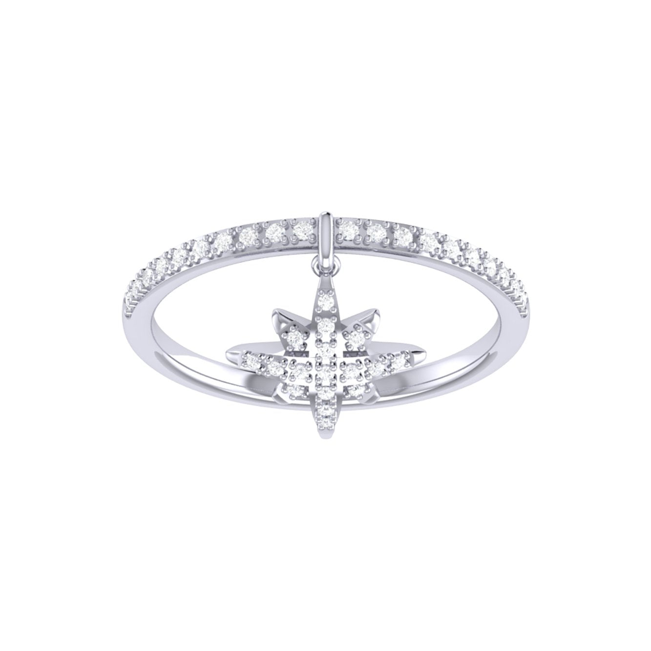 Experience a sense of regality when you wear the North Star Charm Ring. Crafted in 14K White Gold, this ring features 100% natural, genuine diamonds. 0.14 carats of diamonds are used in an individual plate prong setting. This ring is offered in custom sizes. The ring thickness ranges from 2.5mm to 13mm.