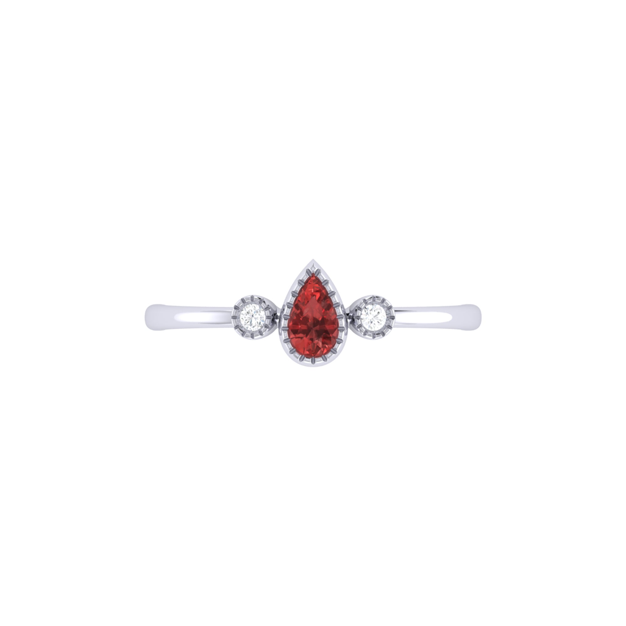 Crafted in 14K White Gold, this ring features a pear shaped garnet gemstone (5 by 3 mm), along with 0.04 carats of genuine, natural diamonds in a bezel setting.