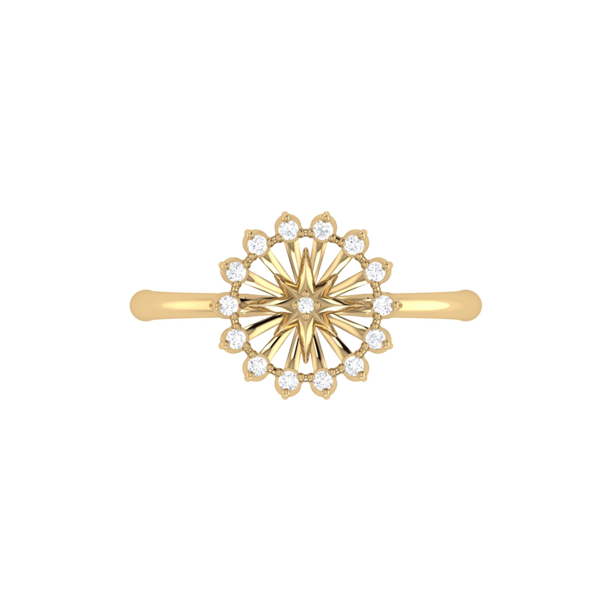 Pair our Starburst Ring with any outfit for the perfect amount of glam. Crafted in 14K Yellow Gold, this ring features 100% natural, genuine diamonds. 0.1 carats of diamonds are used in a collet prong setting. This ring is offered in custom sizes. The ring thickness ranges from 2.4 mm to 11 mm.
