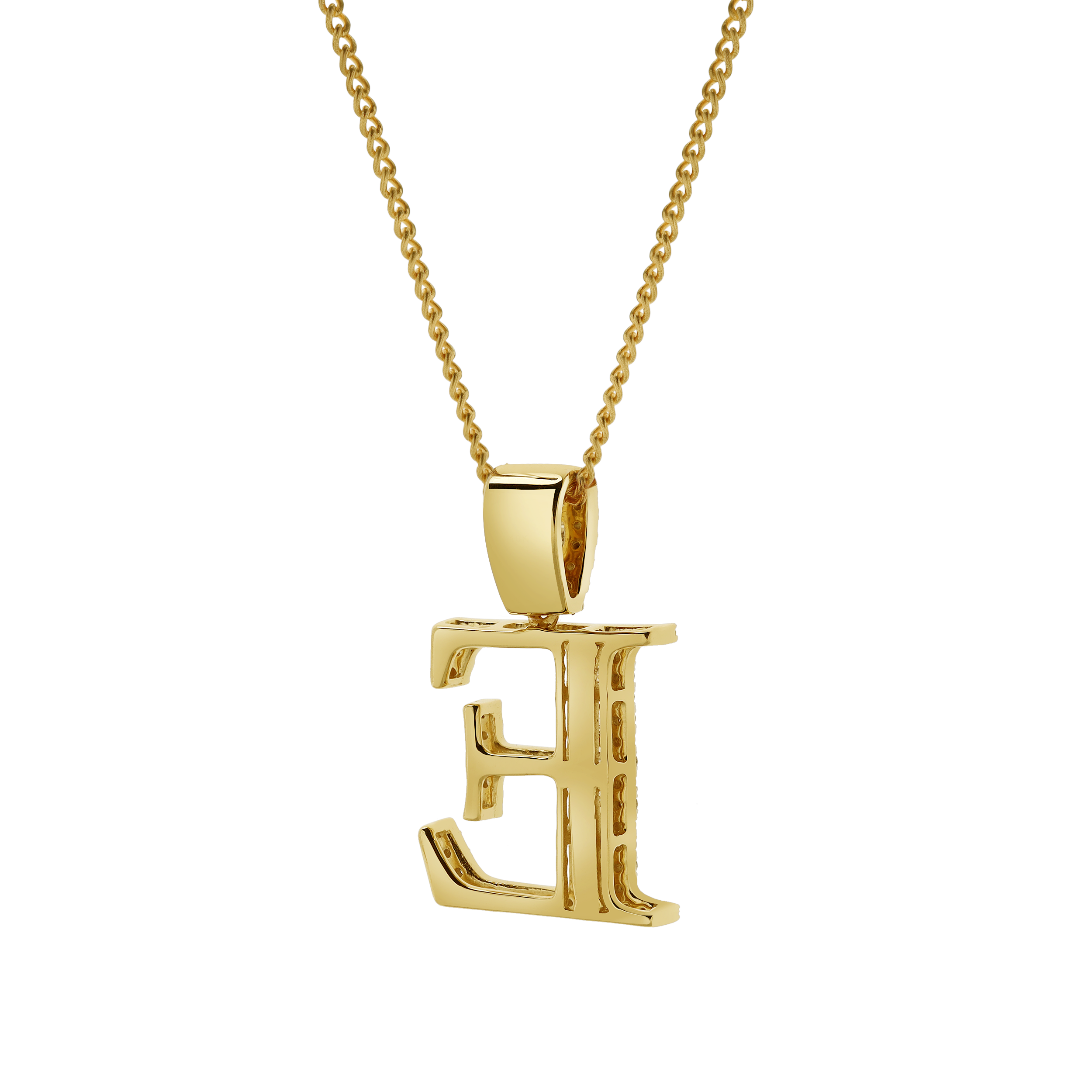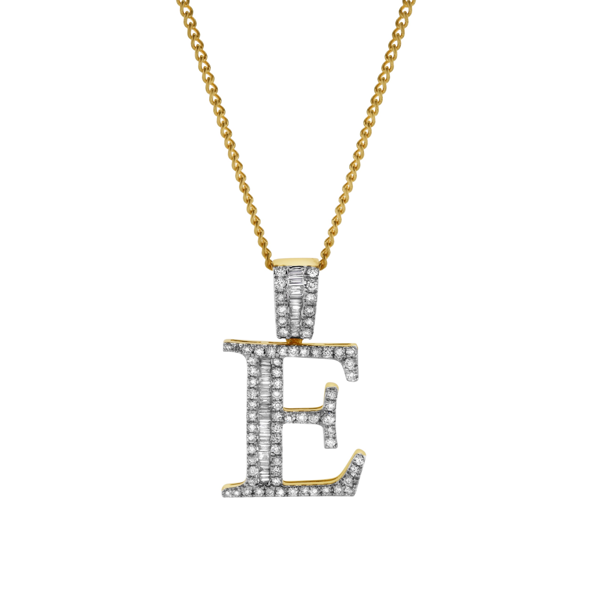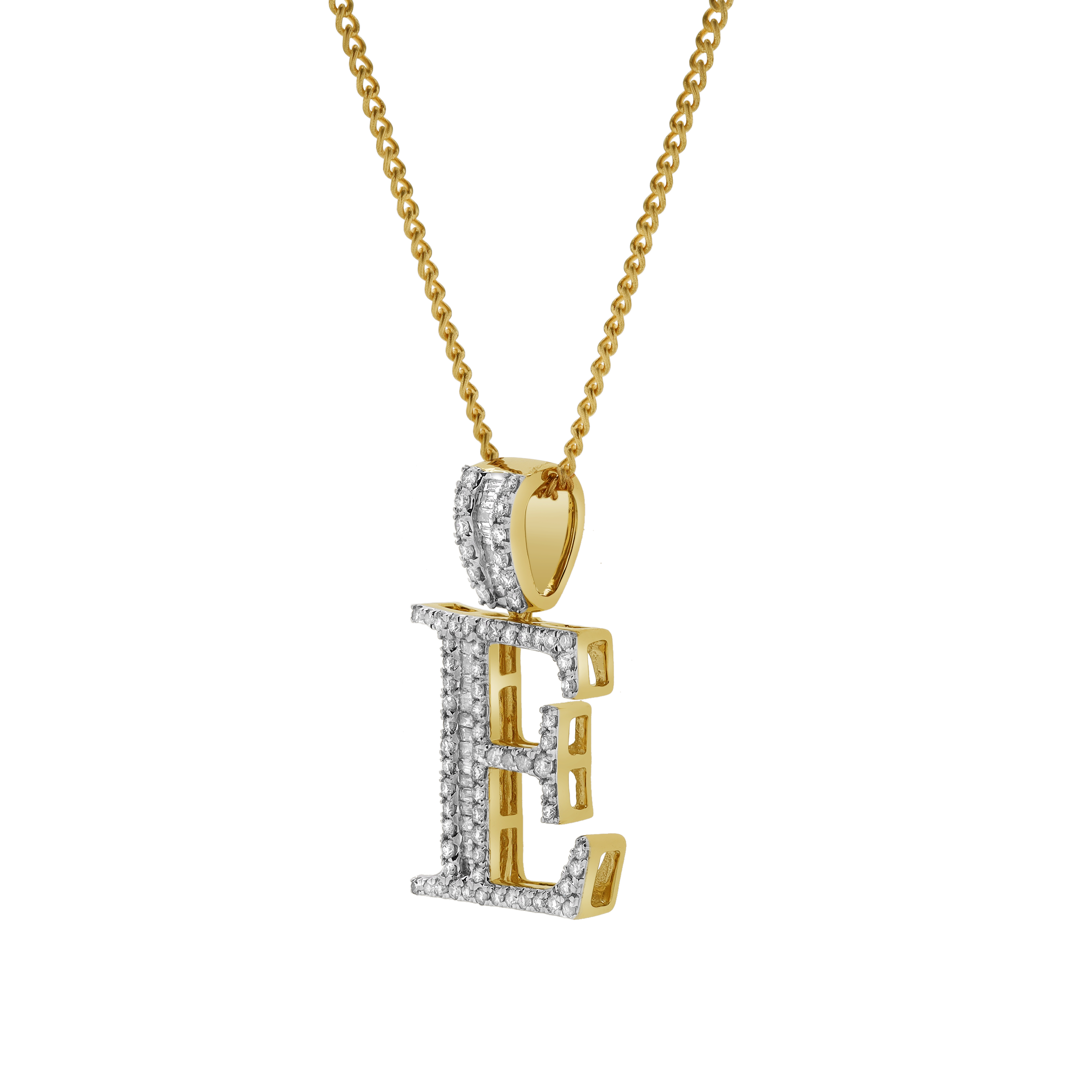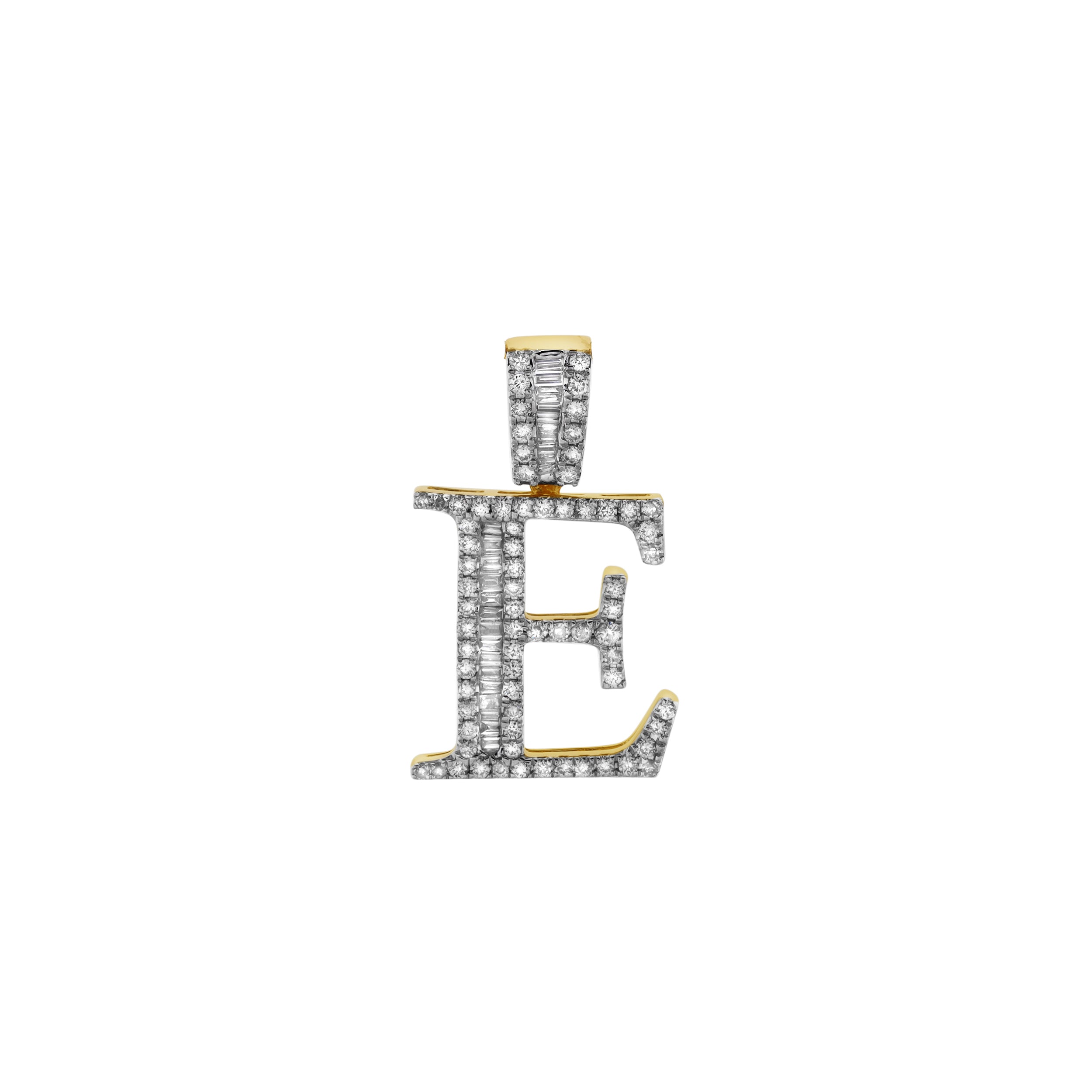 This E initial pendant is crafted in 10K Yellow Gold and features 0.6 carats of G SI1 diamonds. A blend of natural round and baguette diamonds adds brilliance texture and visual depth to the design. With expert craftsmanship and a timeless profile this pendant delivers a personal and elegant touch. CHAIN NOT INCLUDED.