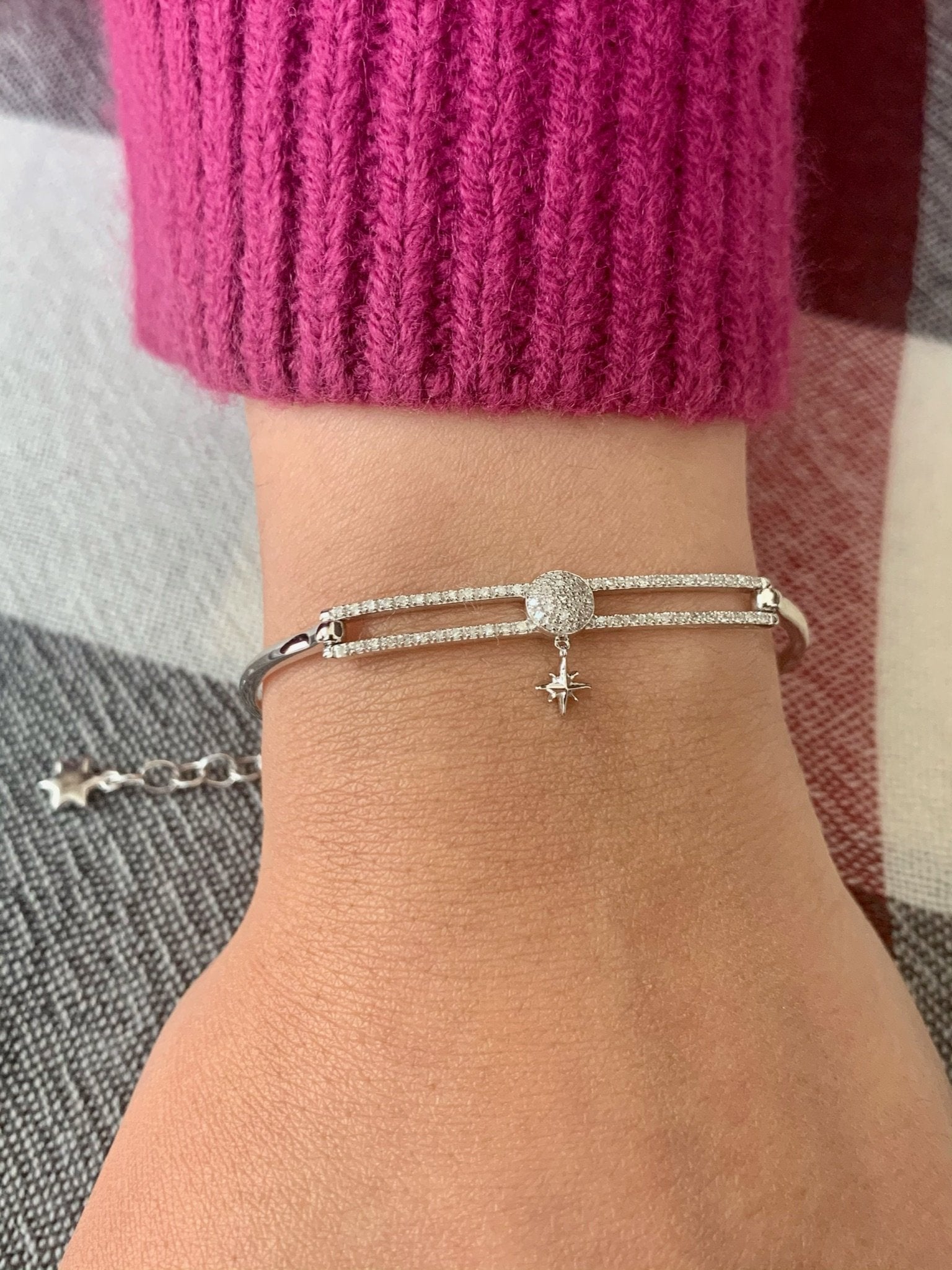 Bring these classy and playful nighttime vibes to your wrist with our Full Moon North Star Bangle. Crafted in 14K White Gold, this bangle features 0.20 carats of 100% natural, genuine diamonds perfectly set in an individual plate prong setting.