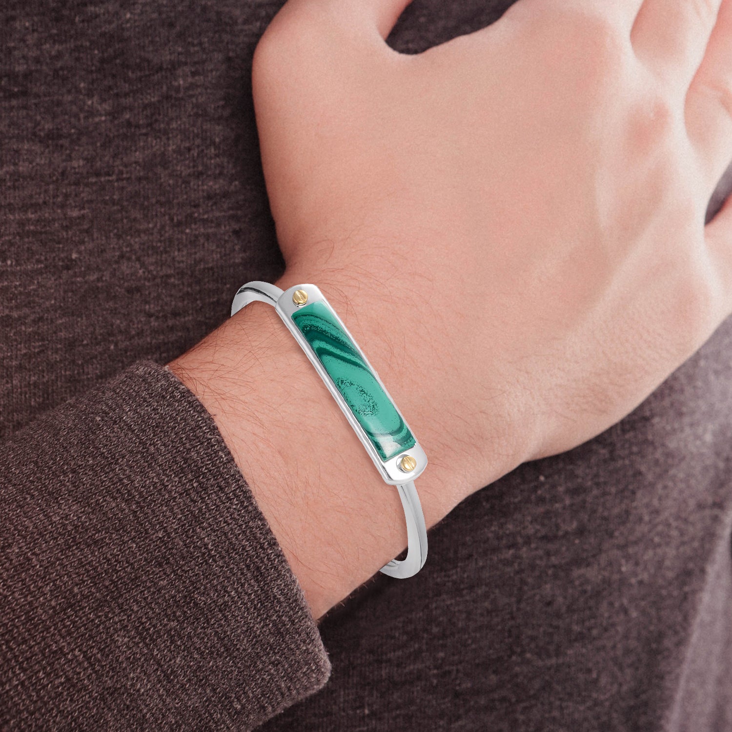 Our Small ID Malachite Sterling Silver Cuff Bracelet offers a sophisticated and modern design. Perfect for the man who desires a touch of elegance with natural green tones.