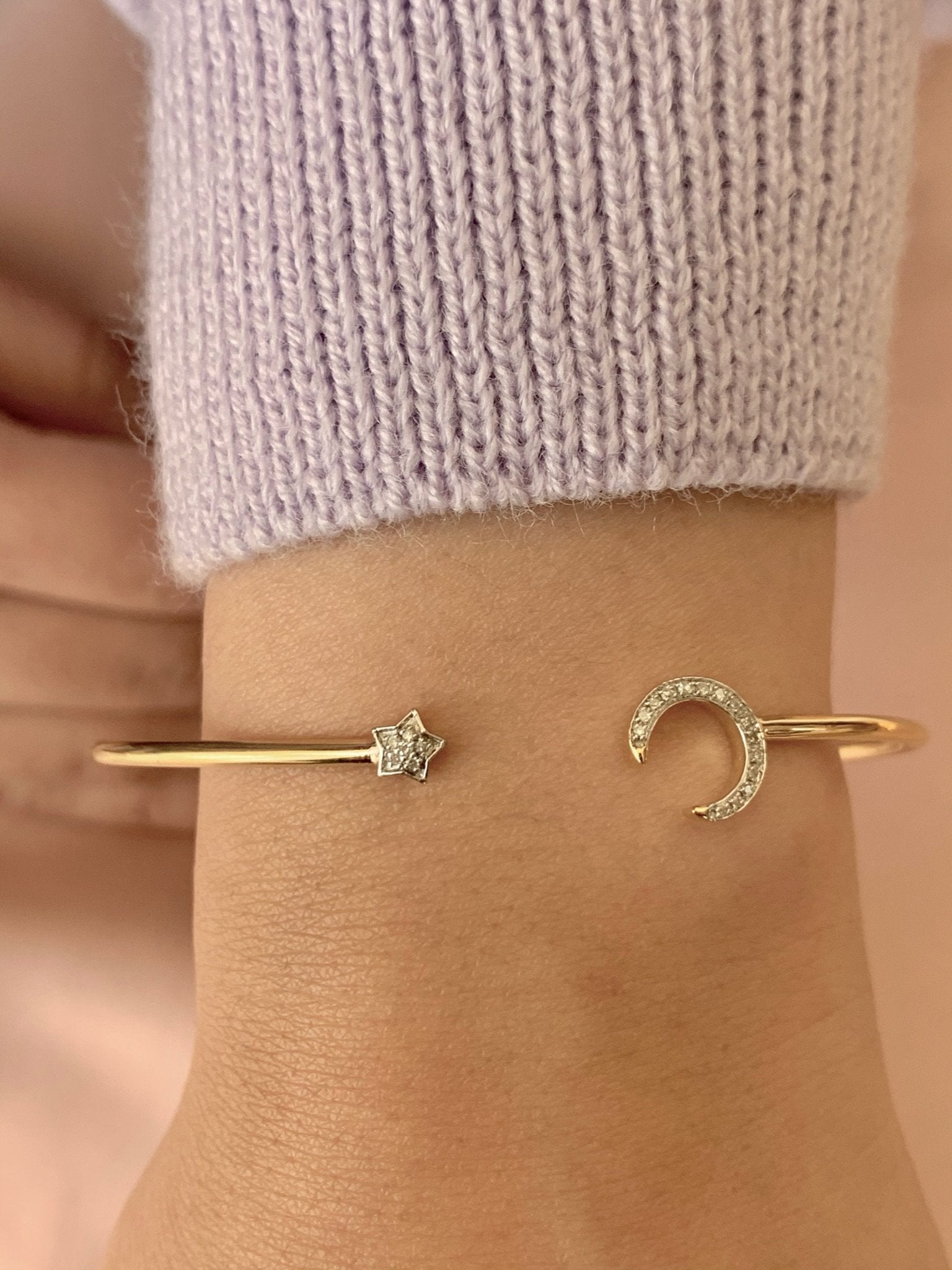 Feel connected to the universe with moonlit stars on your wrist with this cuff. Crafted in 14K Yellow Gold, this cuff features 100% natural, genuine diamonds. 0.05 carats of diamonds are used in individual flat pave and individual plate prong settings. This cuff is 52.5 mm long and 57.1 mm wide. The cuff thickness ranges from 1.9 mm to 9.6 mm.